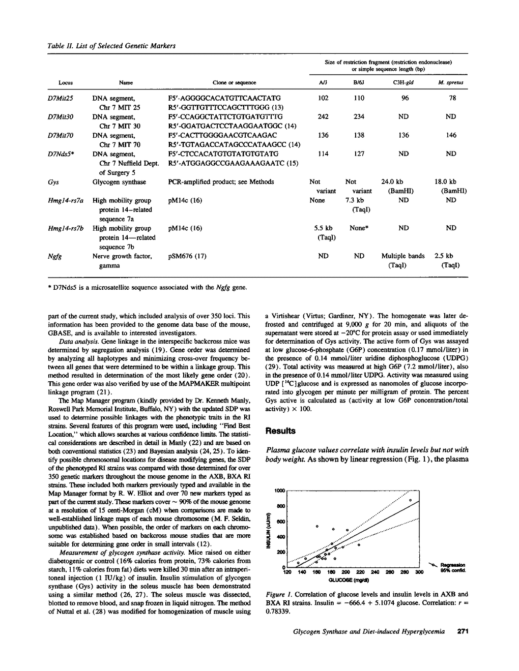 Inbred mouse strains fed a diabetogenic diet have different propensities to develop features analogous to type 2 diabetes mellitus. To define chromosomal locations that control these characteristics, recombinant inbred strains from diabetes-prone C57BL/6J (B/6J) and diabetes-resistant A/J strains were studied. Insulin levels and hyperglycemia correlated with two different regions of mouse chromosome 7 (two point LOD scores > 3.0). For insulin levels, 15 of 16 recombinant inbred strains were concordant with a region that contains the tubby mutation that results in hyperinsulinemia. For hyperglycemia, 19 of 23 strains were concordant with the D7Mit25 marker and 20 of 23 strains with the Gpi-1 locus on proximal mouse chromosome 7. Using more stringent criteria for hyperglycemia, 10 of 11 strains characterized as A/J or B/6J like were concordant with D7Mit25. This putative susceptibility locus is consistent with that of the glycogen synthase gene (Gys) recently suggested as a candidate locus by analyses of type 2 diabetes patients. Fractional glycogen synthase activity in isolated muscle was significantly lower in normal B/6J diabetic-prone mice compared with normal diabetic-resistant A/J mice, a finding similar to that reported in relatives of human patients with type 2 diabetes. These data, taken together, raise the possibility that defects in the Gys gene may in part be responsible for the propensity to develop type 2 diabetes.