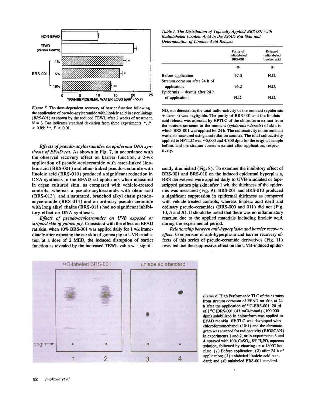 Pseudo-acylceramides with different acyl properties were investigated for their capacity to restore diminished barrier function in essential fatty acid-deficient rats. Daily topical applications of synthetic pseudo-acylceramides containing ester-linked linoleic acid caused a dose-dependent, significant reduction of transepidermal water loss (TEWL). Both other pseudo-acylceramides with ester-linked oleic acid or saturated alkyl chains and ordinary ceramides exhibited a poor effect on recovery of TEWL. Furthermore, pseudoceramide containing ether-linked linoleic acid, which is biologically inactive in terms of degradation by hydrolytic enzymes, also induced a significant and similar increase in the barrier function. This restoration of barrier function by pseudo-acylceramides with linoleic acid was accompanied by suppressed DNA synthesis in the EFAD rat epidermis. In UVB-irradiated guinea pig skin, topical applications of the pseudo-acylceramides with linoleic acid immediately after the exposure significantly reduced epidermal hyperplasia, secondary to markedly diminished barrier disruption, whereas linoleic acid itself did not. A comparison of both the anti-hyperplasia and the barrier recovery effects in the series of pseudo-ceramide derivatives examined revealed that the suppressive effect on the induced epidermal hyperplasia was paralleled by the recovery of the barrier defect in EFAD rats. These findings directly suggest that acylceramide with an ester-linked linoleic acid has an essential role in the epidermal permeability barrier.