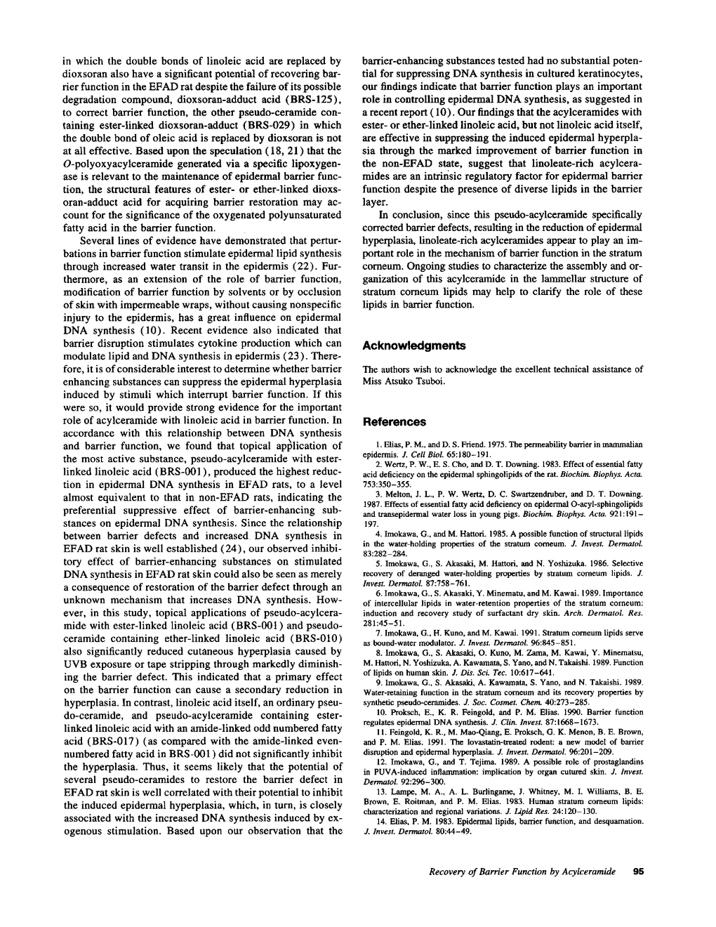 Pseudo-acylceramides with different acyl properties were investigated for their capacity to restore diminished barrier function in essential fatty acid-deficient rats. Daily topical applications of synthetic pseudo-acylceramides containing ester-linked linoleic acid caused a dose-dependent, significant reduction of transepidermal water loss (TEWL). Both other pseudo-acylceramides with ester-linked oleic acid or saturated alkyl chains and ordinary ceramides exhibited a poor effect on recovery of TEWL. Furthermore, pseudoceramide containing ether-linked linoleic acid, which is biologically inactive in terms of degradation by hydrolytic enzymes, also induced a significant and similar increase in the barrier function. This restoration of barrier function by pseudo-acylceramides with linoleic acid was accompanied by suppressed DNA synthesis in the EFAD rat epidermis. In UVB-irradiated guinea pig skin, topical applications of the pseudo-acylceramides with linoleic acid immediately after the exposure significantly reduced epidermal hyperplasia, secondary to markedly diminished barrier disruption, whereas linoleic acid itself did not. A comparison of both the anti-hyperplasia and the barrier recovery effects in the series of pseudo-ceramide derivatives examined revealed that the suppressive effect on the induced epidermal hyperplasia was paralleled by the recovery of the barrier defect in EFAD rats. These findings directly suggest that acylceramide with an ester-linked linoleic acid has an essential role in the epidermal permeability barrier.