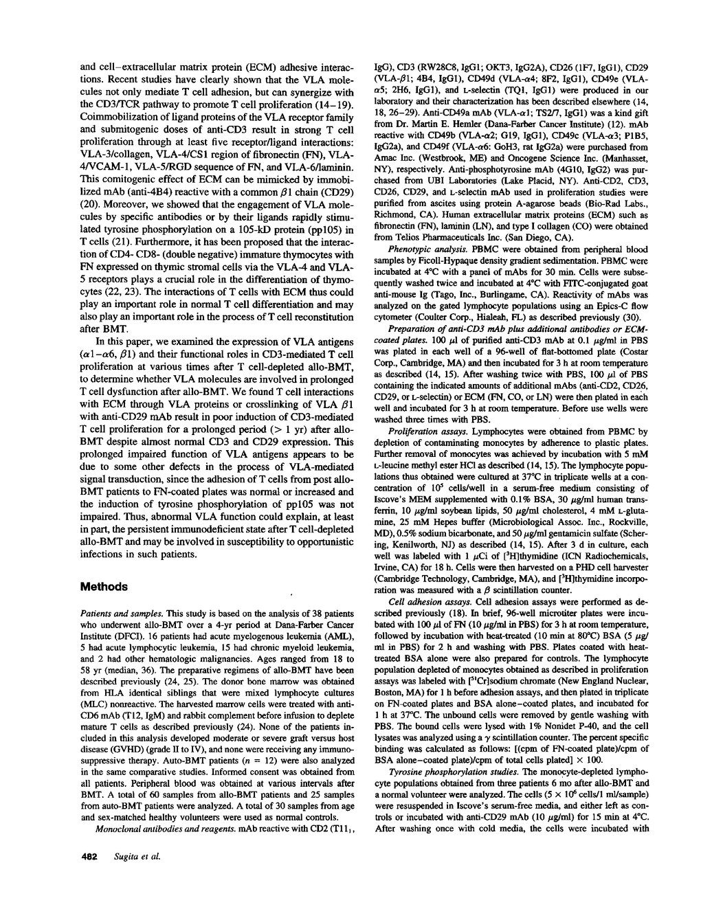 One of the major obstacles in allogeneic bone marrow transplantation (allo-BMT) is prolonged T cell dysfunction resulting in a variety of infectious complications in the months to years after hematologic engraftment. We previously showed that immobilized extracellular matrix (ECM) proteins such as fibronectin (FN), the CS-1 domain of FN, or collagen (CO) acted synergistically with immobilized anti-CD3 to induce T cell proliferation. In addition, the comitogenic effect of ECMs could be mimicked by immobilized mAb reactive with a common beta 1 chain (CD29) of very late activating (VLA) antigens which include ECM receptors. Since the interaction of T cells with ECMs appears to play an important role in the process of T cell reconstitution following allo-BMT, we examined the expression of VLA antigens (alpha 1-alpha 6, beta 1) and their functional roles in CD3-mediated T cell proliferation at various times after T cell depleted allo-BMT. VLA beta 1 as well as VLA alpha 4, alpha 5, and alpha 6 expression was lower than normal controls during the first 3 mo after allo-BMT and auto-BMT, whereas these expressions returned to normal levels by 4 mo after allo-BMT and auto-BMT. Although alpha 1 and alpha 2 were not expressed on lymphocytes from normal controls, these antigens were expressed on lymphocytes at the detectable levels (5-15%) from patients after allo-BMT and auto-BMT. Both CD29 and CD3 were expressed at normal levels on lymphocytes from patients > 3 mo after allo-BMT, whereas T cell interaction with ECM through VLA proteins or crosslinking of VLA beta 1 expressed by T cells with anti-CD29 mAb results in poor induction of CD3-mediated T cell proliferation for a prolonged period (> 1 yr) after allo-BMT. In contrast, T cell proliferation induced by crosslinking of anti-CD2 or anti-CD26 with anti-CD3 was almost fully recovered by 1 yr post-allo-BMT. After autologous BMT, impaired VLA-mediated T cell proliferation via the CD3 pathway after auto-BMT returned to normal levels within 1 yr despite no significant difference in CD3 and CD29 expression following either allo- or auto-BMT. The adhesion of T cells from post-allo-BMT patients to FN-coated plate was normal or increased compared to that of normal controls. Moreover, the induction of the tyrosine phosphorylation of pp105 protein by the ligation of VLA molecules was not impaired in allo-BMT patients. These results suggest that there are some other defects in the process of VLA-mediated signal transduction in such patients. Our results imply that disturbance of VLA function could explain, at least in part, the persistent immunoincompetent state after allo-BMT and may be involved in susceptibility to opportunistic infections after allo-BMT.