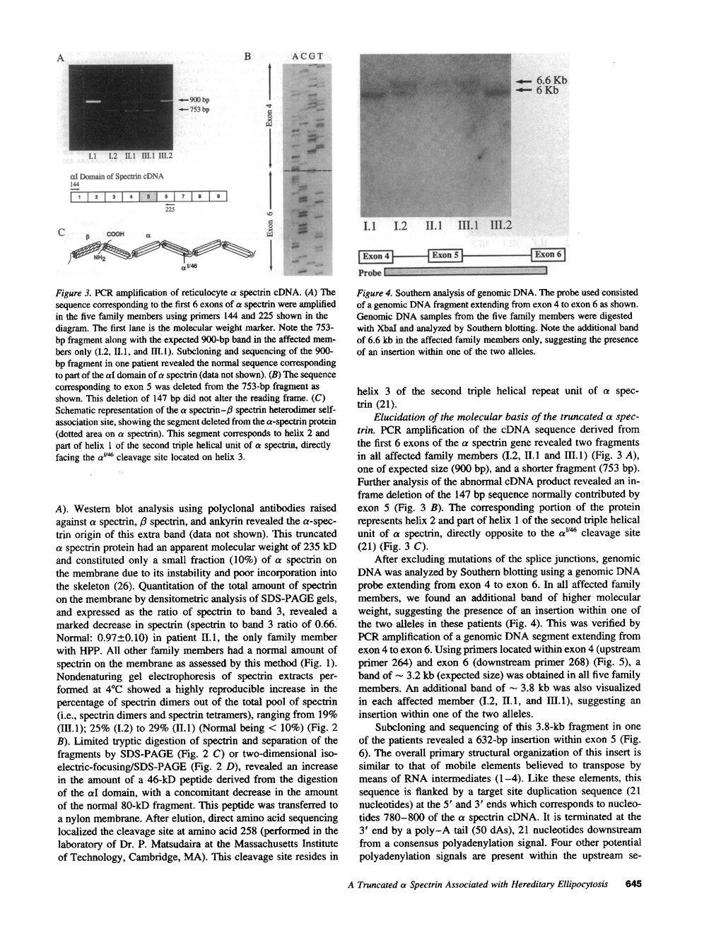 Nonviral retrotransposons, retropseudogenes, and short interspersed nuclear elements (SINEs) are mobile DNA segments capable of transposition to new genomic locations, where they may alter gene expression. De novo integration into specific genes has been described in both germ and somatic cells. We report a family with hereditary elliptocytosis and pyropoikilocytosis associated with a truncated alpha-spectrin protein. We present the biochemical characteristics of this abnormal protein and show that the alpha-spectrin gene is disrupted by a mobile element resulting in exon skipping. This element causes duplication of the insertion site and is terminated by a long poly-A tail downstream of multiple consensus polyadenylation signals. Southern blot analysis of human genomic DNA, using this element as probe, reveals one to three copies per individual. This element has no homology to any previously reported sequence and therefore appears to be a member of a novel family of mobile elements.