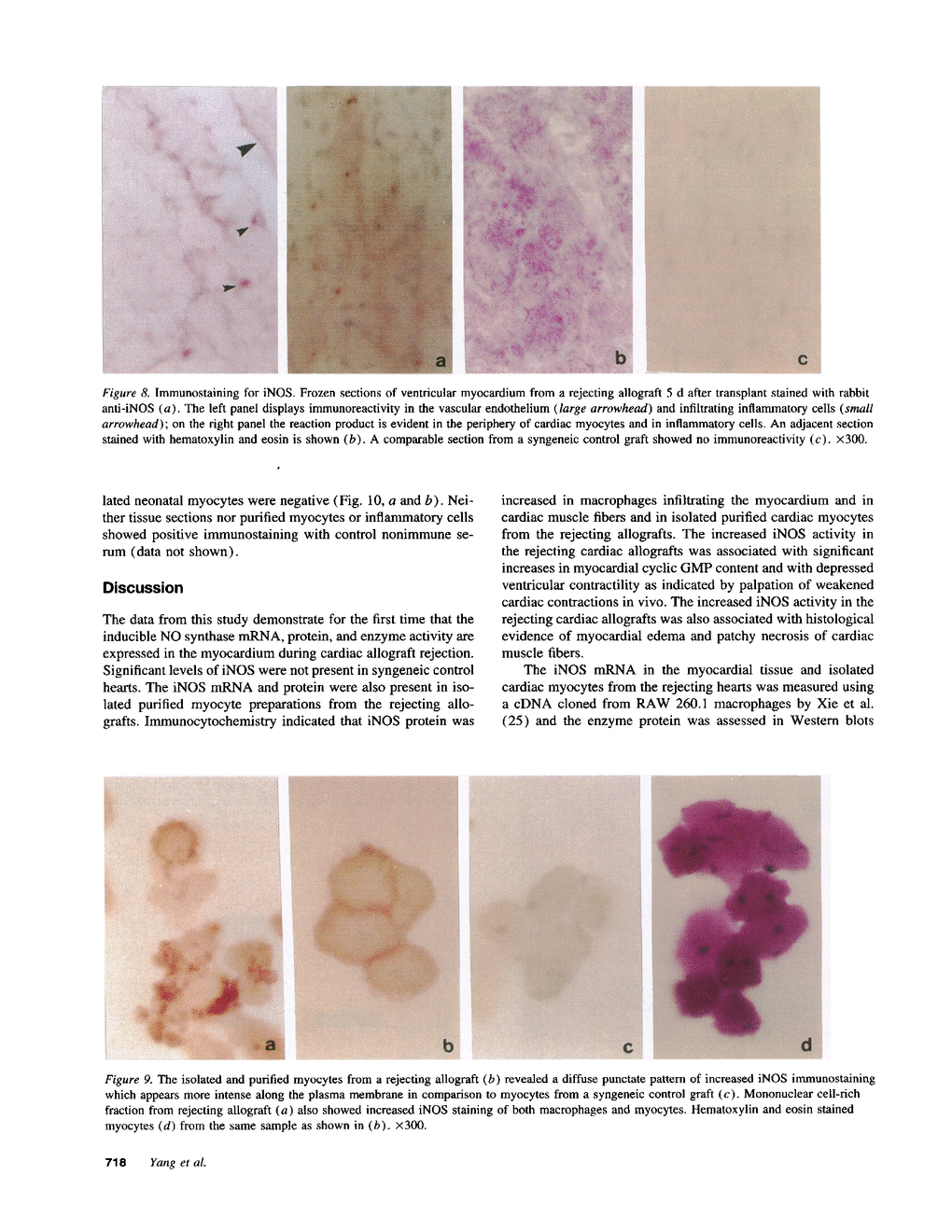 Cardiac transplantation, effective therapy for end-stage heart failure, is frequently complicated by allograft rejection, the mechanisms of which remain incompletely understood. Nitric oxide (NO), a vasodilator which is cytotoxic and negatively inotropic, can be produced in large amounts by an inducible NO synthase (iNOS) in response to cytokines. To investigate whether iNOS is induced during cardiac allograft rejection, hearts from Lewis or Wistar-Furth rats were transplanted into Lewis recipients. At day 5, allogeneic grafts manifested reduced contractility and histologic evidence of rejection (inflammatory infiltrate, edema, necrosis of myocytes). The mRNA for iNOS and iNOS protein were detected in ventricular homogenates and in isolated cardiac myocytes from rejecting allogeneic grafts but not in tissue and myocytes from syngeneic control grafts. Immunocytochemistry showed increased iNOS staining in infiltrating macrophages and in microvascular endothelial cells and cardiac muscle fibers and also in isolated purified cardiac myocytes from the rejecting allografts. Using a myocardial cytosolic iNOS preparation, nitrite formation from L-arginine and [3H] citrulline formation from [3H]L-arginine were increased significantly in the rejecting allogeneic grafts (P < 0.01). Myocardial cyclic GMP was also increased significantly (P < 0.05). The data indicate myocardial iNOS mRNA, protein and enzyme activity are induced in infiltrating macrophages and cardiac myocytes of the rejecting allogeneic grafts. Synthesis of NO by iNOS may contribute to myocyte necrosis and ventricular failure during cardiac allograft rejection.