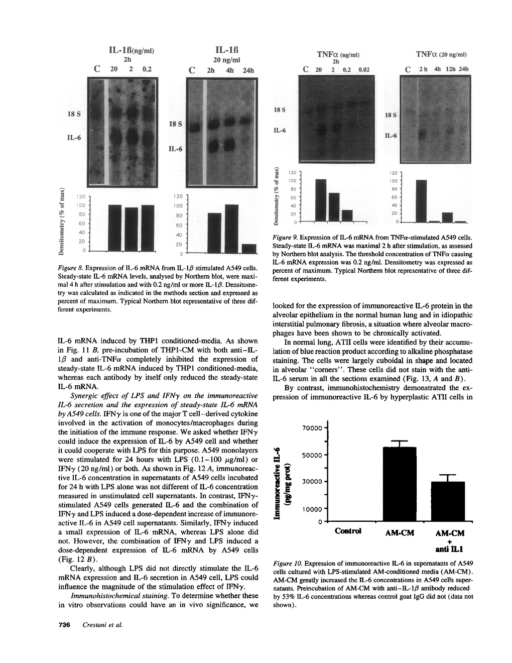 The aims of this study were (a) to determine if rat alveolar type II (ATII) cells and human pulmonary epithelial-derived cells (A549 cell line) could generate IL-6 in vitro, (b) to characterize the cytokine regulation of IL-6 gene and protein expression in these cells, and (c) to detect the in vivo expression of immunoreactive IL-6 by human ATII cells. Rat ATII cells in primary culture secreted bioactive IL-6 and immunostained with an anti-IL-6 antiserum. Spontaneous IL-6 secretion by rat ATII cells amounted to 5,690 +/- 770 pg/ml/10(6) cells (n = 12) and was fivefold higher than spontaneous rat alveolar macrophages IL-6 secretion (1,052 +/- 286 pg/ml/10(6) cells, n = 8, P = 0.001). Rat alveolar macrophage conditioned media (CM) increased IL-6 secretion by rat ATII cells through the effect of IL-1 and TNF. IL-6 gene expression and IL-6 secretion by A549 cells was induced by IL-1 beta, TNF alpha, and by human alveolar macrophages and THP1 cells CM. Induction was abolished when CM were preincubated with anti-IL-1 beta and anti-TNF alpha antibody. The combination of IFN gamma and LPS induced the expression of IL-6 mRNA by A549 cells whereas LPS alone had no effect. Immunohistochemical staining evidenced the expression of immunoreactive IL-6 by hyperplastic ATII cells in fibrotic human lung, a condition in which alveolar macrophages are known to be activated. ATII cells in normal human lung did not express immunoreactive IL-6. Our findings demonstrate that ATII cells may be an important source of IL-6 in the alveolar space thereby participating to the regulation of the intra-alveolar immune response.