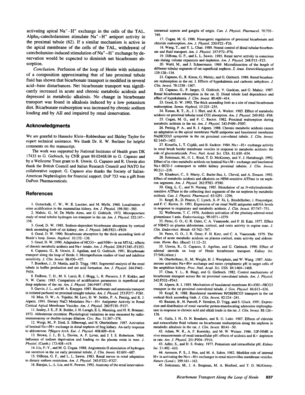 The loop of Henle contributes to renal acidification by reabsorbing about 15% of filtered bicarbonate. To study the effects on loop of Henle bicarbonate transport (JHCO3) of acid-base disturbances and of several factors known to modulate sodium transport, these in vivo microperfusion studies were carried out in rats during: (a) acute and chronic metabolic acidosis, (b) acute and chronic (hypokalemic) metabolic alkalosis, (c) a control sodium diet, (d) a high-sodium diet, (e) angiotensin II (AII) intravenous infusion, (f) simultaneously intravenous infusion of both AII and the AT1 receptor antagonist DuP 753, (g) acute ipsilateral mechanicochemical renal denervation. Acute and chronic metabolic acidosis increased JHCO3; acute metabolic alkalosis significantly reduced JHCO3, whereas chronic hypokalemic alkalosis did not alter JHCO3. Bicarbonate transport increased in animals on a high-sodium intake and following AII administration, and the latter was inhibited by the AII (AT1) receptor antagonist DuP 753; acute renal denervation lowered bicarbonate transport. These data indicate that bicarbonate reabsorption along the loop of Henle in vivo is closely linked to systemic acid-base status and to several factors known to modulate sodium transport.