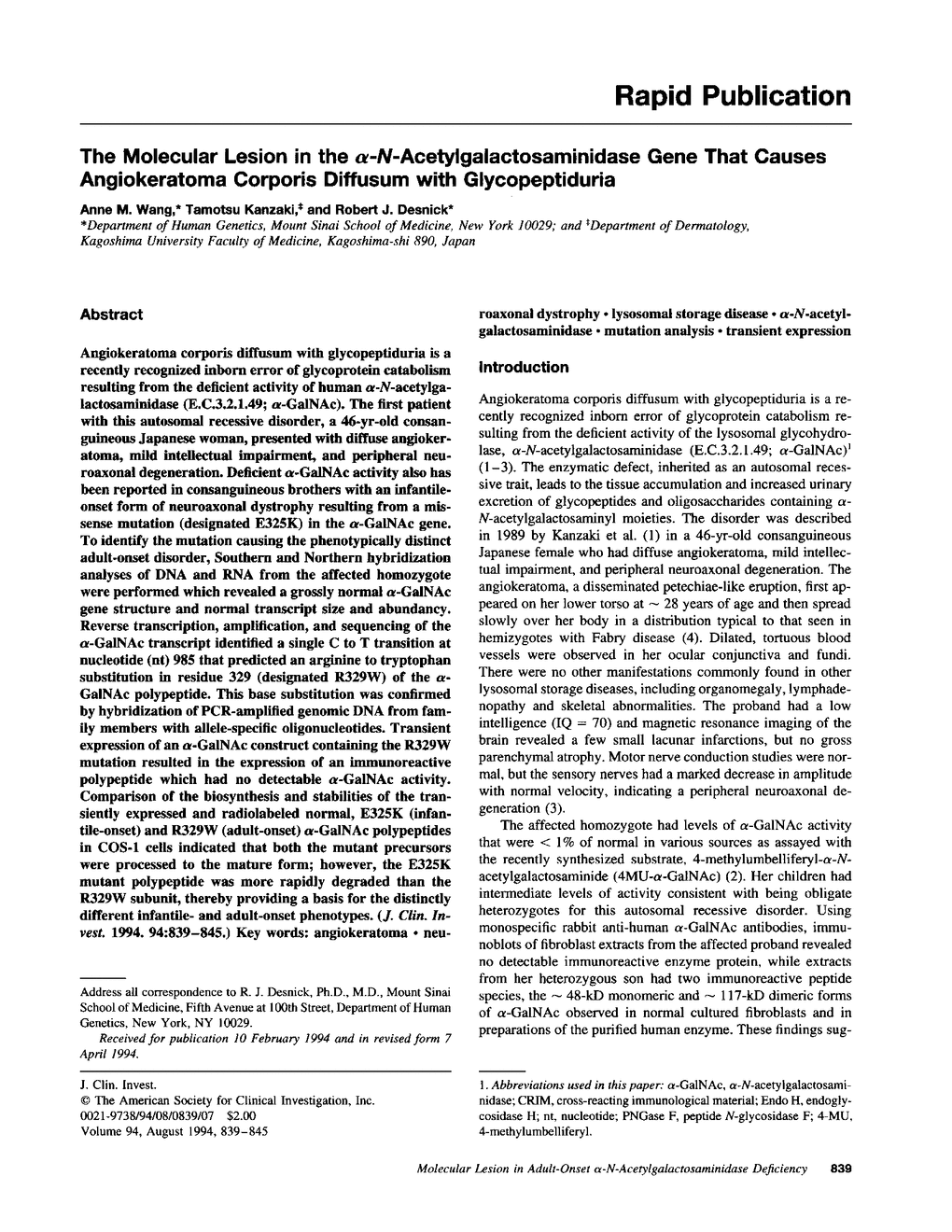 A M Wang, T Kanzaki, R J Desnick