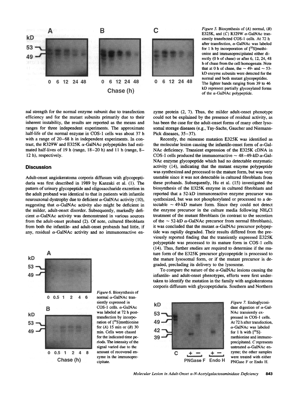 Angiokeratoma corporis diffusum with glycopeptiduria is a recently recognized inborn error of glycoprotein catabolism resulting from the deficient activity of human alpha-N-acetylgalactosaminidase (E.C. 3.2.1.49; alpha-GalNAc). The first patient with this autosomal recessive disorder, a 46-yr-old consanguineous Japanese woman, presented with diffuse angiokeratoma, mild intellectual impairment, and peripheral neuroaxonal degeneration. Deficient alpha-GalNAc activity also has been reported in consanguineous brothers with an infantile-onset form of neuroaxonal dystrophy resulting from a missense mutation (designated E325K) in the alpha-GalNAc gene. To identify the mutation causing the phenotypically distinct adult-onset disorder, Southern and Northern hybridization analyses of DNA and RNA from the affected homozygote were performed which revealed a grossly normal alpha-GalNAc gene structure and normal transcript size and abundancy. Reverse transcription, amplification, and sequencing of the alpha-GalNAc transcript identified a single C to T transition at nucleotide (nt) 985 that predicted an arginine to tryptophan substitution in residue 329 (designated R329W) of the alpha-GalNAc polypeptide. This base substitution was confirmed by hybridization of PCR-amplified genomic DNA from family members with allele-specific oligonucleotides. Transient expression of an alpha-GalNAc construct containing the R329W mutation resulted in the expression of an immunoreactive polypeptide which had no detectable alpha-GalNAc activity. Comparison of the biosynthesis and stabilities of the transiently expressed and radiolabeled normal, E325K (infantile-onset) and R329W (adult-onset) alpha-GalNAc polypeptides in COS-1 cells indicated that both the mutant precursors were processed to the mature form; however, the E325K mutant polypeptide was more rapidly degraded than the R329W subunit, thereby providing a basis for the distinctly different infantile- and adult-onset phenotypes.