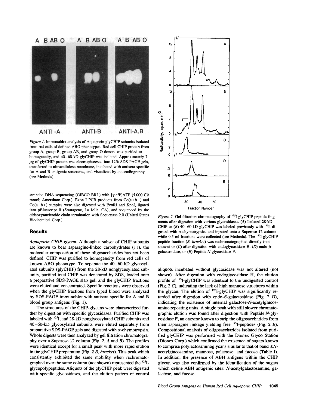 Blood group antigens are structural variants in surface carbohydrate or amino acid polymorphisms on extracellular domains of membrane proteins. The red cell water channel-forming integral protein (Aquaporin CHIP) is a homotetramer with only one N-glycosylated subunit, however no CHIP-associated blood group antigens have yet been identified. Immunoblotting, monosaccharide composition analysis, and selective glycosidase digestions revealed that the CHIP-associated oligosaccharide contains ABH determinants and resembles a band 3-type glycan that cannot be cleaved from intact membranes by Peptide:N-glycosidase F. The molecular structure of the Colton antigens was previously unknown, but CHIP was selectively immunoprecipitated with anti-Coa or anti-Co(b). The DNA sequence from Colton-typed individuals predicted that residue 45 is alanine in the Co(a+b-) phenotype and valine in the Co(a-b+) phenotype. The nucleotide polymorphism corresponds to a PflMI endonuclease digestion site in the DNA from Co(a-b+) individuals. These studies have defined antigens within two blood group systems on CHIP: (a) an ABH-bearing polylactosaminoglycan attached to a poorly accessible site in the native membrane; and (b) the Colton antigen polymorphism which may permit the identification of rare individuals with defective water channel expression.