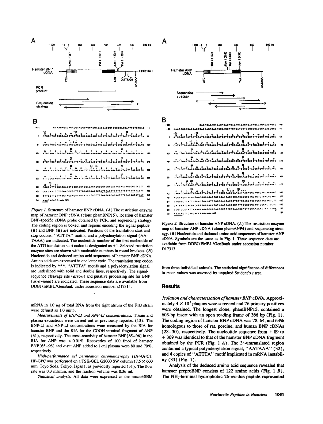 Brain and atrial natriuretic peptides (BNP and ANP) are cardiac hormones with diuretic, natriuretic, and vasodilatory activities. Cardiomyopathic hamsters are widely used animal models of heart failure. Due to the structural divergence of BNP among species, examination on pathophysiological roles of BNP using cardiomyopathic hamsters is so far impossible. We therefore isolated hamster BNP and ANP cDNAs, and investigated synthesis and secretion of these peptides in normal and cardiomyopathic hamsters. The COOH-terminal 32-residue peptide of cloned hamster preproBNP with 122 amino acids, preceded by a single arginine residue, supposedly represents hamster BNP showing < 50% homology to rat BNP. Alpha-hamster ANP, 28-residue peptide, is identical to alpha-rat ANP. In hamsters, BNP and ANP occur mainly in the ventricle and the atrium, respectively. The 32-wk-old hypertrophic cardiomyopathic BIO14.6 strain exhibited ventricular hypertrophy. The 32-wk-old dilated cardiomyopathic BIO53.58 strain remained at the stage without apparent heart failure. In BIO14.6 and BIO53.58 strains at this age, ventricular BNP and ANP gene expressions are augmented, and the plasma BNP concentration is elevated to 136 and 108 fmol/ml, respectively, three times greater than the elevated plasma ANP concentration, which well mimics changes of the plasma BNP and ANP concentrations in human heart failure. Cardiomyopathic hamsters, therefore, are useful models to investigate the implication of BNP in human cardiovascular diseases.