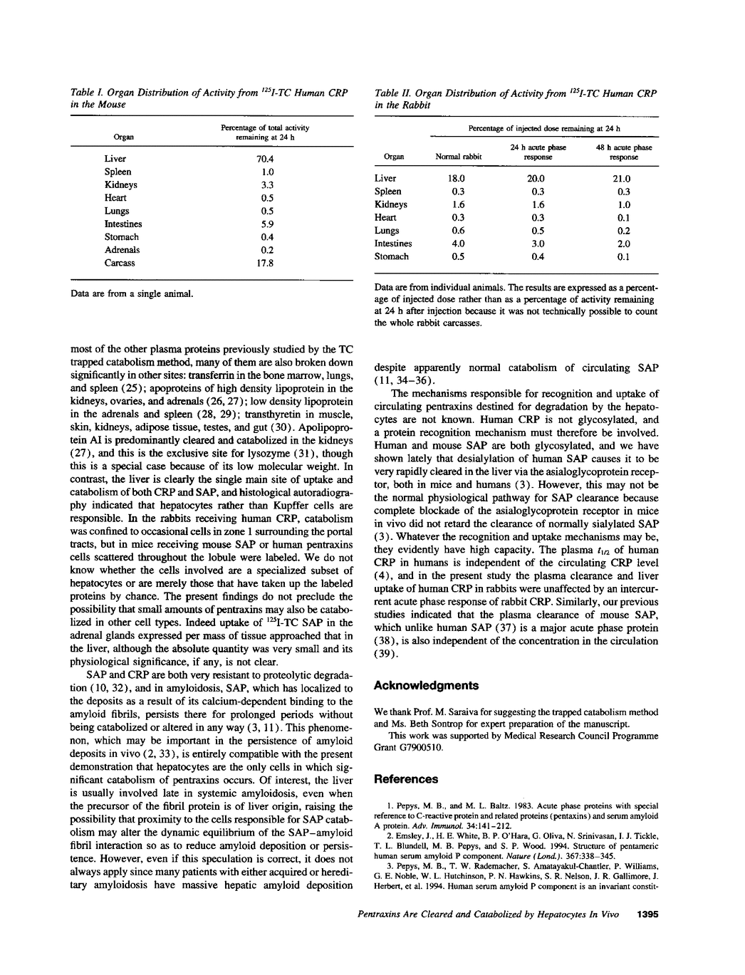 The cellular sites of clearance and degradation of the pentraxin plasma proteins, C-reactive protein, the classical acute phase reactant, and serum amyloid P component (SAP), a universal constituent of amyloid deposits, were sought using the ligand 125I-tyramine cellobiose (TC) which is substantially retained within the cells in which catabolism takes place. Pentraxins labeled with 125I-TC showed the same in vitro and in vivo ligand binding and the same in vivo plasma t1/2 as the directly iodinated proteins and the native unlabeled pentraxins, indicating that their mode of clearance was likely to be physiological. After intravenous injection into mice and rabbits of human C-reactive protein, human SAP, and mouse SAP, each labeled with 125I-TC, most of the radioactivity remaining in the body at 24 h was located in hepatocytes. None was detected in other liver cells, and only traces were present in other viscera; the rest was in the carcass, representing intact pentraxins in the blood and extravascular compartment, and escaped label which had not yet been excreted. Hepatocytes are thus the single major site of pentraxin clearance and catabolism in vivo. This is consistent with the observation that SAP that has localized to amyloid deposits persists there and is not degraded.