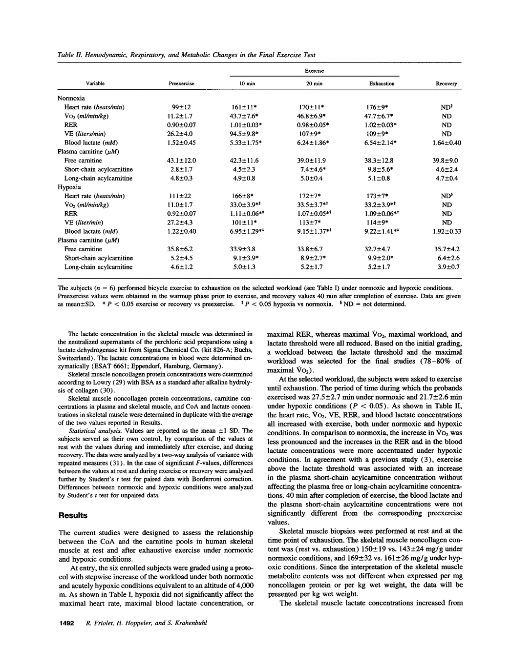 Skeletal muscle CoA and carnitine metabolism were investigated in six human volunteers at rest and after exhaustive exercise under normoxic and hypoxic conditions. In comparison to the values at rest, exhaustive exercise was associated with a three- to fourfold increase in the skeletal muscle lactate, and with a twofold increase in the acetyl-CoA content, both under normoxic and hypoxic conditions. Since exercise did not significantly affect the skeletal muscle CoA radical (CoASH), total acid-soluble, or total CoA contents, the increase in the acetyl-CoA content was at the expense of short-chain acyl-CoAs different from acetyl-CoA. With exhaustive exercise, the skeletal muscle acetylcarnitine and short-chain acylcarnitine contents increased by a factor of three to four both under normoxic and hypoxic conditions. In contrast to the CoA pool, these increases were associated with a decrease in the free carnitine content, whereas the total acid-soluble and total carnitine contents were not affected by exercise. After exhaustive exercise, the skeletal muscle acetyl-CoA/CoASH ratio showed a linear correlation with the corresponding acetylcarnitine/free carnitine ratio. The plasma short-chain acylcarnitine concentration increased by a factor of two to three during exercise, and was not significantly different from the values at rest 40 min after completion of exercise. Thus, the current studies illustrate the close interaction between the CoA and carnitine pools in the exercising human skeletal muscle, and they underscore the important role of carnitine in maintaining the muscular CoASH content during exhaustive exercise.