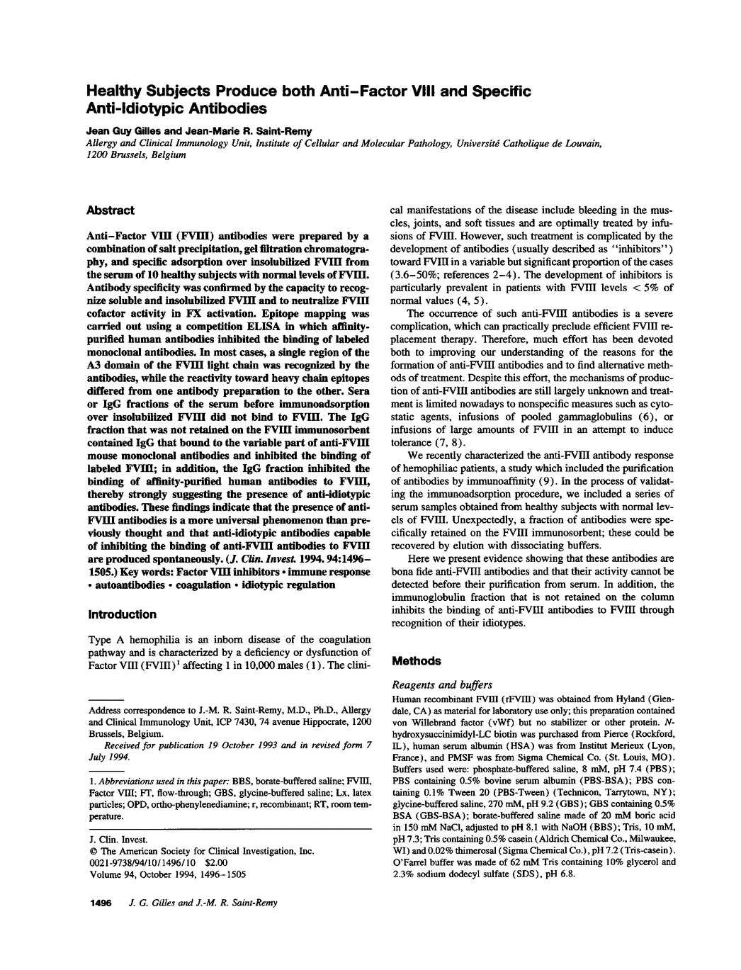 Anti-Factor VIII (FVIII) antibodies were prepared by a combination of salt precipitation, gel filtration chromatography, and specific adsorption over insolubilized FVIII from the serum of 10 healthy subjects with normal levels of FVIII. Antibody specificity was confirmed by the capacity to recognize soluble and insolubilized FVIII and to neutralize FVIII cofactor activity in FX activation. Epitope mapping was carried out using a competition ELISA in which affinity-purified human antibodies inhibited the binding of labeled monoclonal antibodies. In most cases, a single region of the A3 domain of the FVIII light chain was recognized by the antibodies, while the reactivity toward heavy chain epitopes differed from one antibody preparation to the other. Sera or IgG fractions of the serum before immunoadsorption over insolubilized FVIII did not bind to FVIII. The IgG fraction that was not retained on the FVIII immunosorbent contained IgG that bound to the variable part of anti-FVIII mouse monoclonal antibodies and inhibited the binding of labeled FVIII; in addition, the IgG fraction inhibited the binding of affinity-purified human antibodies to FVIII, thereby strongly suggesting the presence of anti-idiotypic antibodies. These findings indicate that the presence of anti-FVIII antibodies is a more universal phenomenon than previously thought and that anti-idiotypic antibodies capable of inhibiting the binding of anti-FVIII antibodies to FVIII are produced spontaneously.
