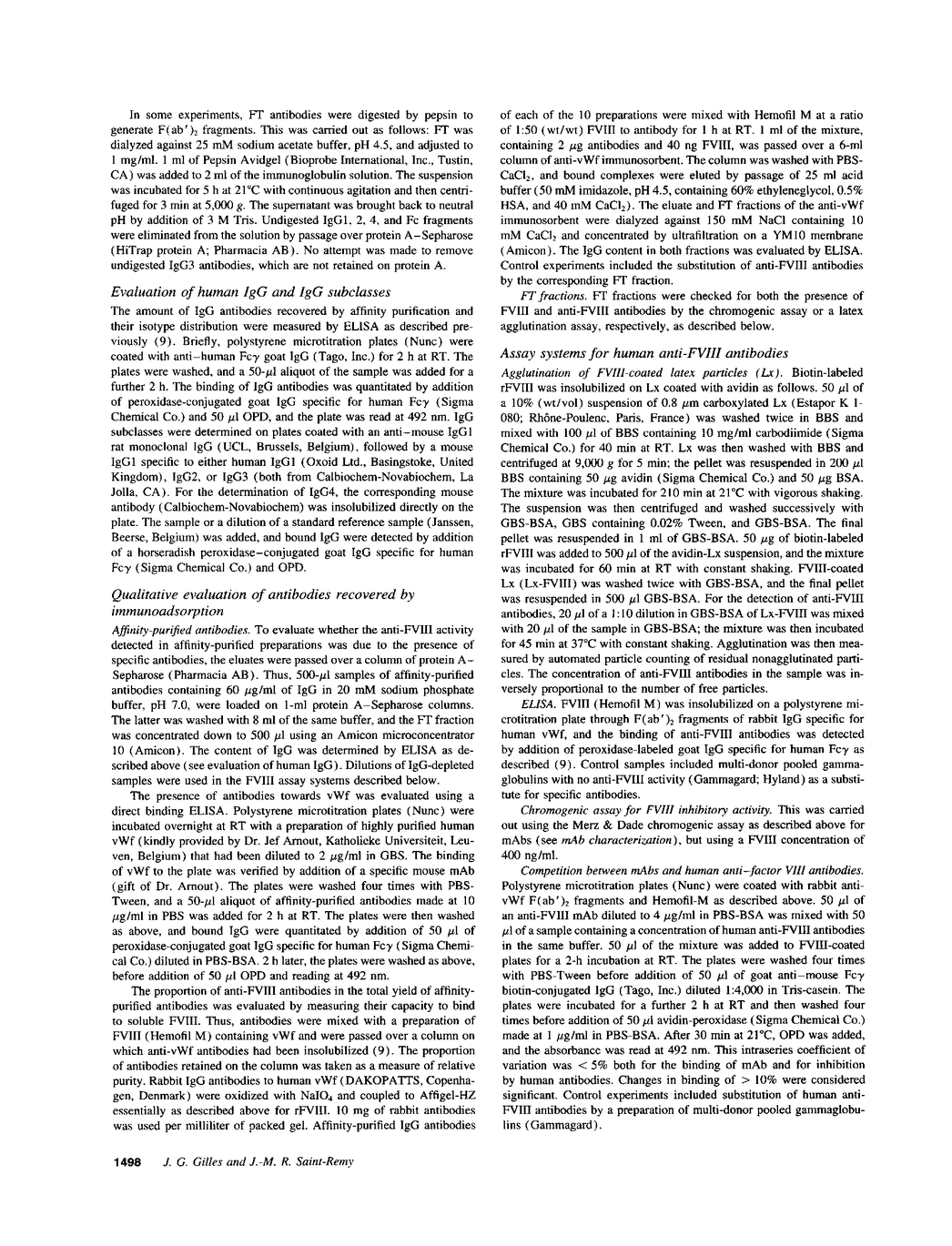 Anti-Factor VIII (FVIII) antibodies were prepared by a combination of salt precipitation, gel filtration chromatography, and specific adsorption over insolubilized FVIII from the serum of 10 healthy subjects with normal levels of FVIII. Antibody specificity was confirmed by the capacity to recognize soluble and insolubilized FVIII and to neutralize FVIII cofactor activity in FX activation. Epitope mapping was carried out using a competition ELISA in which affinity-purified human antibodies inhibited the binding of labeled monoclonal antibodies. In most cases, a single region of the A3 domain of the FVIII light chain was recognized by the antibodies, while the reactivity toward heavy chain epitopes differed from one antibody preparation to the other. Sera or IgG fractions of the serum before immunoadsorption over insolubilized FVIII did not bind to FVIII. The IgG fraction that was not retained on the FVIII immunosorbent contained IgG that bound to the variable part of anti-FVIII mouse monoclonal antibodies and inhibited the binding of labeled FVIII; in addition, the IgG fraction inhibited the binding of affinity-purified human antibodies to FVIII, thereby strongly suggesting the presence of anti-idiotypic antibodies. These findings indicate that the presence of anti-FVIII antibodies is a more universal phenomenon than previously thought and that anti-idiotypic antibodies capable of inhibiting the binding of anti-FVIII antibodies to FVIII are produced spontaneously.
