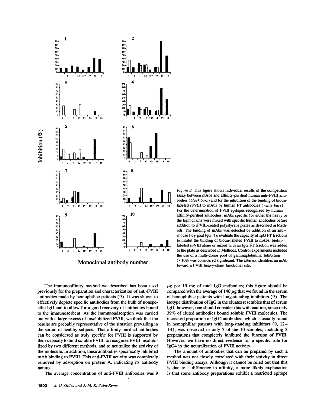 Anti-Factor VIII (FVIII) antibodies were prepared by a combination of salt precipitation, gel filtration chromatography, and specific adsorption over insolubilized FVIII from the serum of 10 healthy subjects with normal levels of FVIII. Antibody specificity was confirmed by the capacity to recognize soluble and insolubilized FVIII and to neutralize FVIII cofactor activity in FX activation. Epitope mapping was carried out using a competition ELISA in which affinity-purified human antibodies inhibited the binding of labeled monoclonal antibodies. In most cases, a single region of the A3 domain of the FVIII light chain was recognized by the antibodies, while the reactivity toward heavy chain epitopes differed from one antibody preparation to the other. Sera or IgG fractions of the serum before immunoadsorption over insolubilized FVIII did not bind to FVIII. The IgG fraction that was not retained on the FVIII immunosorbent contained IgG that bound to the variable part of anti-FVIII mouse monoclonal antibodies and inhibited the binding of labeled FVIII; in addition, the IgG fraction inhibited the binding of affinity-purified human antibodies to FVIII, thereby strongly suggesting the presence of anti-idiotypic antibodies. These findings indicate that the presence of anti-FVIII antibodies is a more universal phenomenon than previously thought and that anti-idiotypic antibodies capable of inhibiting the binding of anti-FVIII antibodies to FVIII are produced spontaneously.