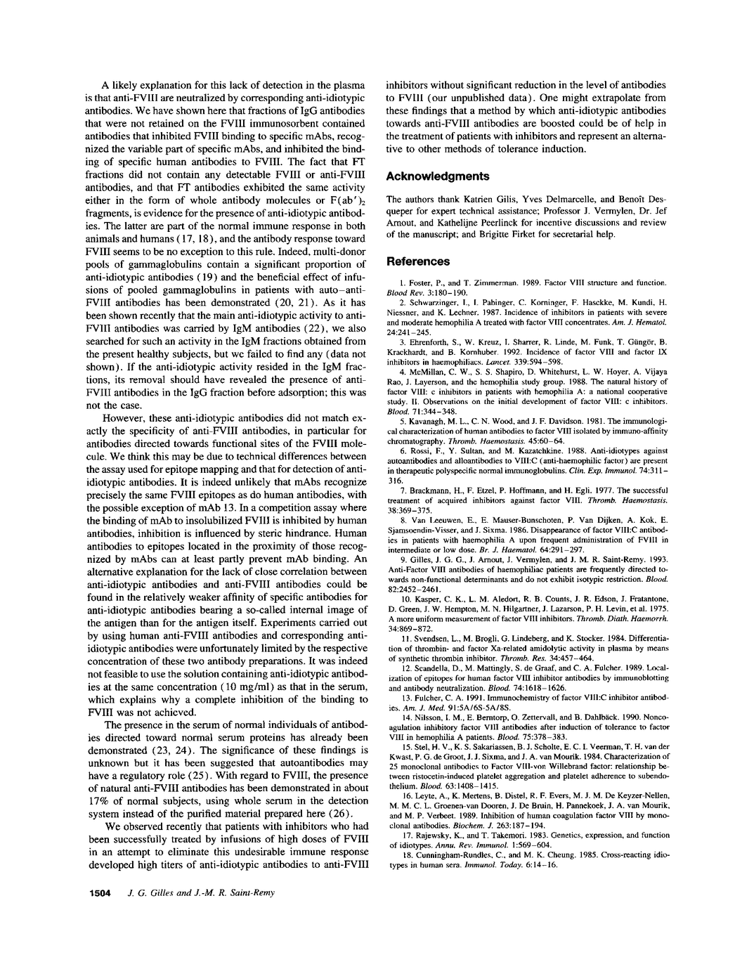 Anti-Factor VIII (FVIII) antibodies were prepared by a combination of salt precipitation, gel filtration chromatography, and specific adsorption over insolubilized FVIII from the serum of 10 healthy subjects with normal levels of FVIII. Antibody specificity was confirmed by the capacity to recognize soluble and insolubilized FVIII and to neutralize FVIII cofactor activity in FX activation. Epitope mapping was carried out using a competition ELISA in which affinity-purified human antibodies inhibited the binding of labeled monoclonal antibodies. In most cases, a single region of the A3 domain of the FVIII light chain was recognized by the antibodies, while the reactivity toward heavy chain epitopes differed from one antibody preparation to the other. Sera or IgG fractions of the serum before immunoadsorption over insolubilized FVIII did not bind to FVIII. The IgG fraction that was not retained on the FVIII immunosorbent contained IgG that bound to the variable part of anti-FVIII mouse monoclonal antibodies and inhibited the binding of labeled FVIII; in addition, the IgG fraction inhibited the binding of affinity-purified human antibodies to FVIII, thereby strongly suggesting the presence of anti-idiotypic antibodies. These findings indicate that the presence of anti-FVIII antibodies is a more universal phenomenon than previously thought and that anti-idiotypic antibodies capable of inhibiting the binding of anti-FVIII antibodies to FVIII are produced spontaneously.