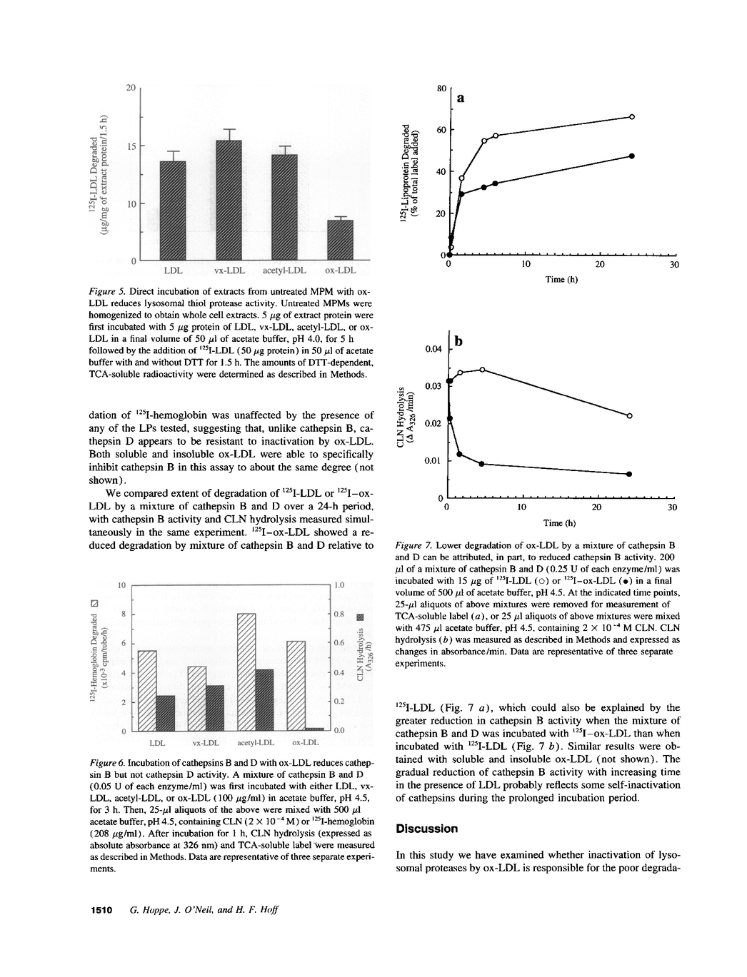 Deficient processing of apo B in oxidized LDL (ox-LDL) by macrophage lysosomal proteases has been documented and attributed to modifications in apo B. We have investigated whether direct inactivation of lysosomal proteases by ox-LDL could also be responsible for this deficient degradation. When mouse peritoneal macrophages (MPM) were preincubated for 21 h at 37 degrees C with ox-LDL, LDL, or vortex-aggregated LDL, only ox-LDL inhibited the subsequent degradation of 125I-labeled forms of the above lipoproteins. Uptake of labeled lipoproteins was not appreciably affected by preincubation with ox-LDL, suggesting that the inhibition was at the level of lysosomal degradation. Thiol protease activity of cell extracts at pH 4.0, was reduced in MPM preincubated with ox-LDL relative to cells preincubated with LDL or medium alone. Extracts from untreated MPM, or mixtures of cathepsin B and D, showed a reduced ability to degrade 125I-LDL at pH 4.5 and reduced cathepsin B activity, after incubation with ox-LDL relative to incubation with LDL. Thus, the reduced degradation of lipoproteins in MPM pretreated with ox-LDL could be due to direct inactivation of the lysosomal protease, cathepsin B.