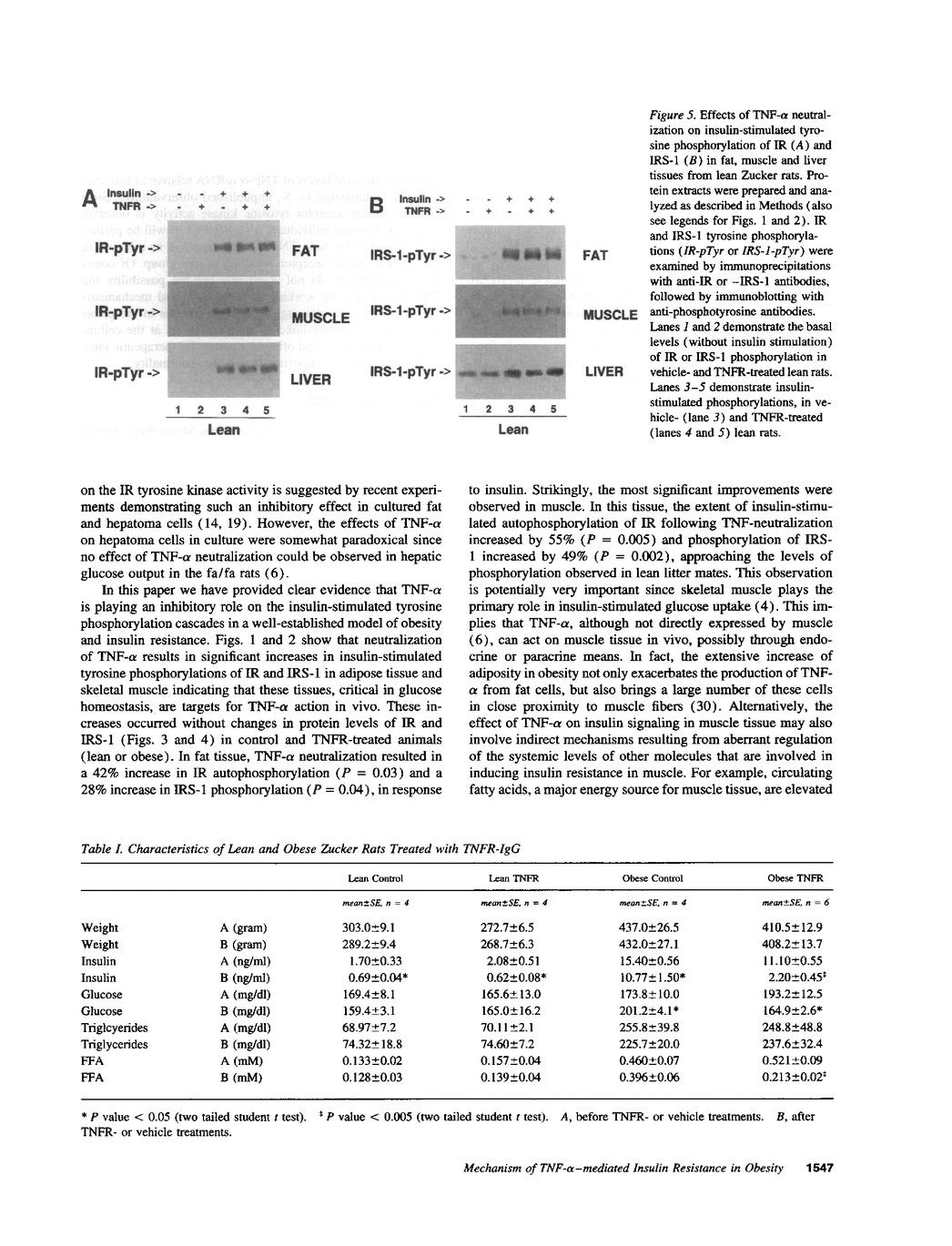 Insulin resistance is an important metabolic abnormality often associated with infections, cancer, obesity, and especially non-insulin-dependent diabetes mellitus (NIDDM). We have previously demonstrated that tumor necrosis factor-alpha produced by adipose tissue is a key mediator of insulin resistance in animal models of obesity-diabetes. However, the mechanism by which TNF-alpha interferes with insulin action is not known. Since a defective insulin receptor (IR) tyrosine kinase activity has been observed in obesity and NIDDM, we measured the IR tyrosine kinase activity in the Zucker (fa/fa) rat model of obesity and insulin resistance after neutralizing TNF-alpha with a soluble TNF receptor (TNFR)-lgG fusion protein. This neutralization resulted in a marked increase in insulin-stimulated autophosphorylation of the IR, as well as phosphorylation of insulin receptor substrate 1 (IRS-1) in muscle and fat tissues of the fa/fa rats, restoring them to near control (lean) levels. In contrast, no significant changes were observed in insulin-stimulated tyrosine phosphorylations of IR and IRS-1 in liver. The physiological significance of the improvements in IR signaling was indicated by a concurrent reduction in plasma glucose, insulin, and free fatty acid levels. These results demonstrate that TNF-alpha participates in obesity-related systemic insulin resistance by inhibiting the IR tyrosine kinase in the two tissues mainly responsible for insulin-stimulated glucose uptake: muscle and fat. Images