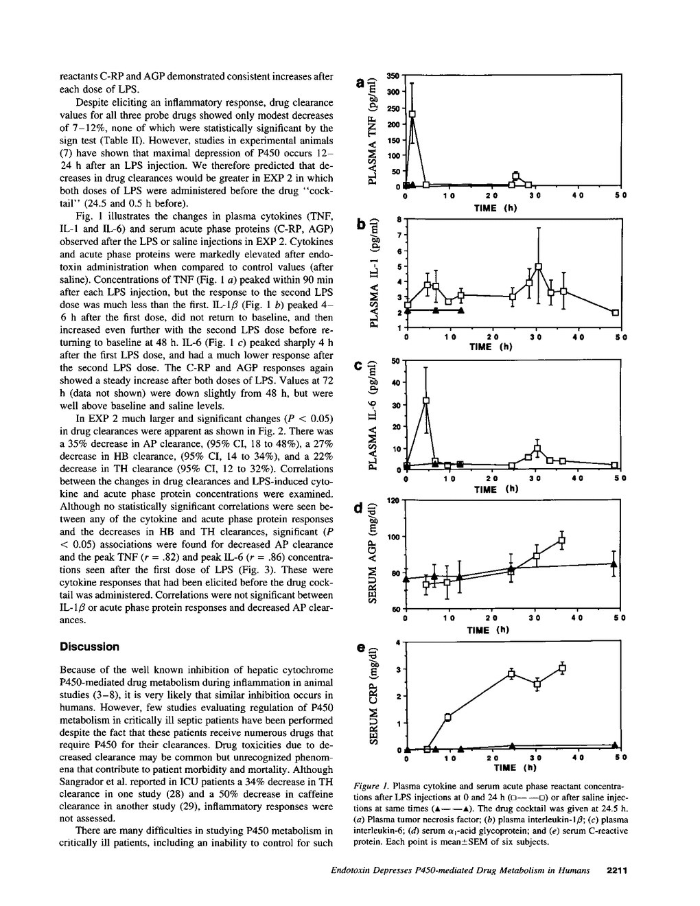 In experimental animals, injection of gram-negative endotoxin (LPS) decreases hepatic cytochrome P450-mediated drug metabolism. To evaluate this phenomenon in a human model of gram-negative sepsis, LPS was administered on two consecutive days to healthy male volunteers during which time a cocktail of antipyrine (AP-250 mg), hexobarbital (HB-500 mg), and theophylline (TH-150 mg) was ingested and the apparent oral clearance of each drug determined. Each subject had a control drug clearance study with saline injections. In the first experiment, six subjects received the drug cocktail 0.5 h after the first dose of LPS. In the second experiment, another six subjects received the drug cocktail 0.5 h after the second dose of LPS. In both experiments, LPS caused the expected physiologic responses of inflammation including fever with increases in serum concentrations of TNF alpha, IL-1 beta, IL-6, and acute phase reactants. In the first experiment, only minor decreases in clearances of the probe drugs were observed (7-12%). However in the second experiment, marked decreases in the clearances of AP (35, 95% CI 18-48%), HB (27, 95% CI 14-34%), and TH (22, 95% CI 12-32%) were seen. The decreases in AP clearance correlated with initial peak values of TNF alpha (r = 0.82) and IL-6 (r = 0.86). These data show that in humans the inflammatory response to even a very low dose of LPS significantly decreases hepatic cytochrome P450-mediated drug metabolism and this effect evolves over a 24-h period. It is likely that septic patients with much higher exposures to LPS have more profound inhibition of drug metabolism.