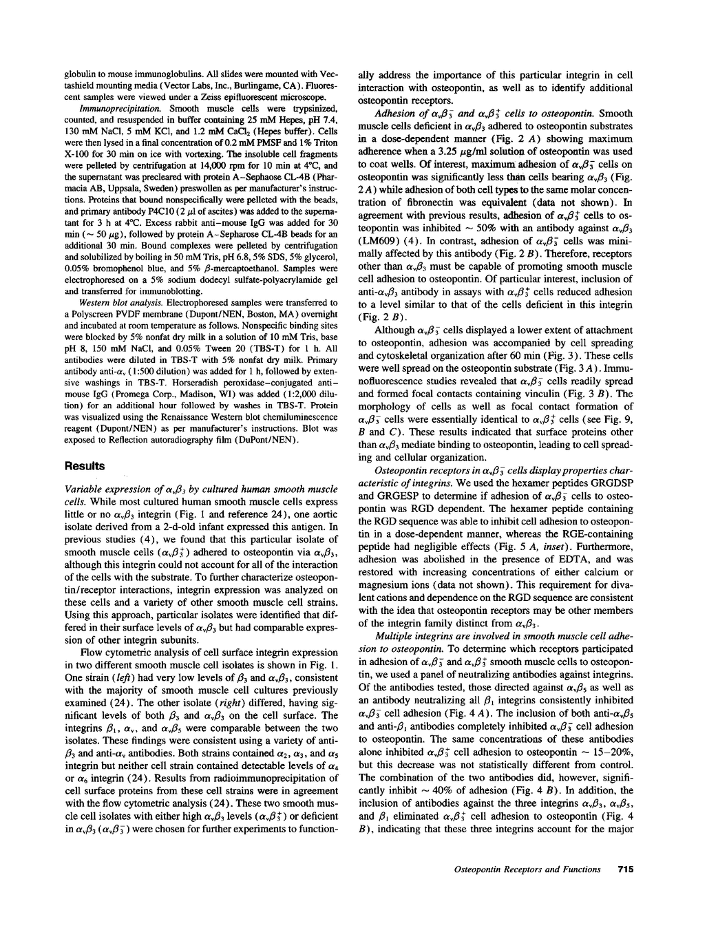 Osteopontin is an arginine-glycine-aspartate containing acidic glycoprotein postulated to mediate adhesion, migration, and biomineralization in diverse tissues. The mechanisms explaining this multifunctionality are not well understood, although it is known that one osteopontin receptor is the alpha v beta 3 integrin. In this work, we studied human smooth muscle cells varying in alpha v beta 3 levels to identify additional osteopontin receptors. We report that, in addition to alpha v beta 3, both alpha v beta 5 and alpha v beta 1 are osteopontin receptors. Moreover, the presence or absence of alpha v beta 3 on the cell surface altered the adhesive and migratory responses of smooth muscle cells to osteopontin. Adhesion of alpha v beta 3-deficient cell populations to osteopontin was only half that of cells containing alpha v beta 3, and migration toward an osteopontin gradient in the Boyden chamber was dependent on cell surface alpha v beta 3. Although alpha v beta 3-deficient smooth muscle cells were unable to migrate to osteopontin, they did migrate significantly in response to vitronectin and fibronectin. These findings represent the first description of alpha v beta 5 and alpha v beta 1 as osteopontin receptors and suggest that, while adhesion to osteopontin is supported by integrins containing beta 1, beta 3, and beta 5, migration in response to osteopontin appears to depend on alpha v beta 3. Thus, interaction with distinct receptors is one mechanism by which osteopontin may initiate multiple functions.