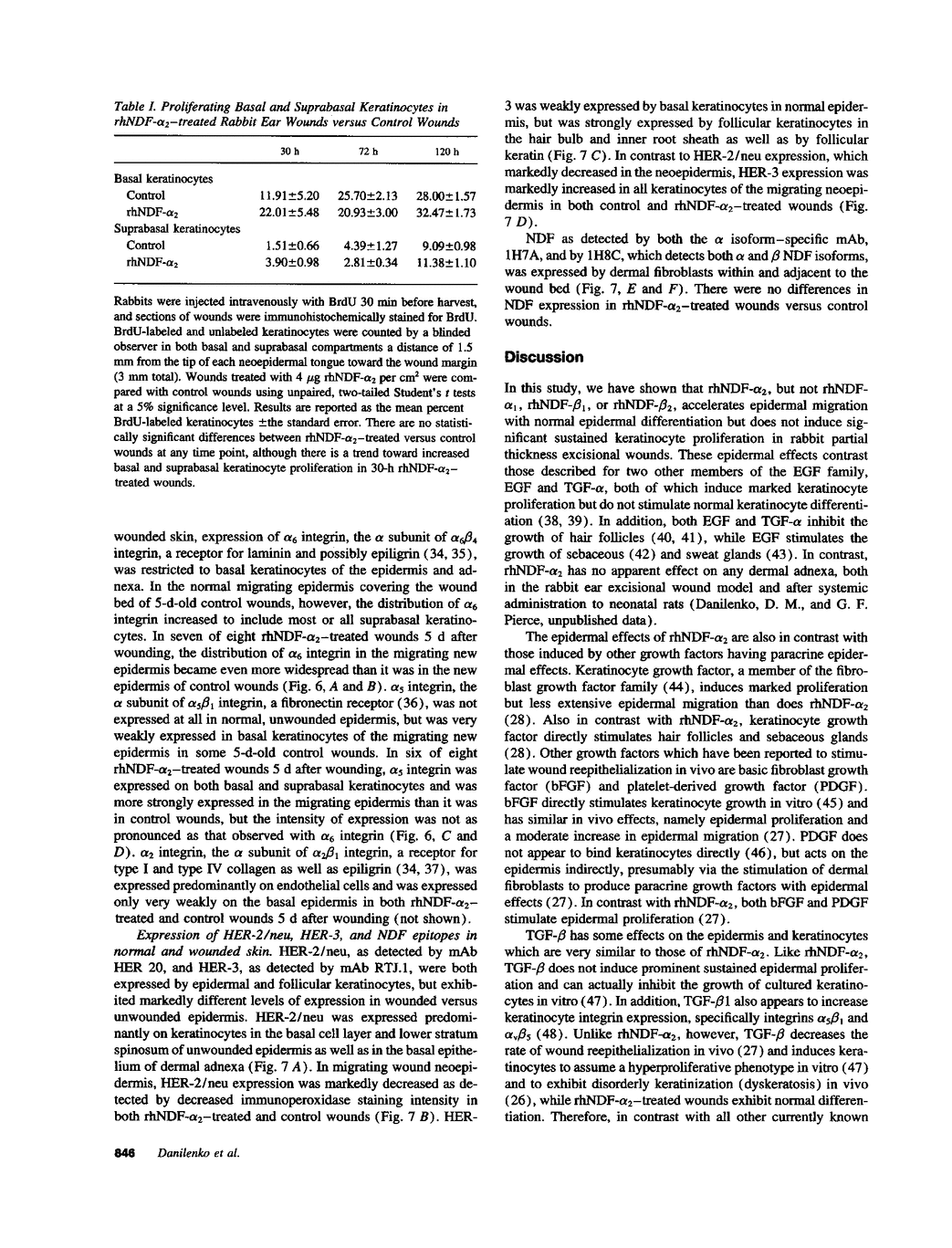 Neu differentiation factor (NDF) is a 44-kD glycoprotein which was isolated from ras-transformed rat fibroblasts and indirectly induces tyrosine phosphorylation of the HER-2/neu receptor via binding to either the HER-3 or HER-4 receptor. NDF contains a receptor binding epidermal growth factor (EGF)-like domain and is a member of the EGF family. There are multiple different isoforms of NDF which arise by alternative splicing of a single gene. To date, in vivo biologic activities have not been demonstrated for any NDF isoform. Since NDF, HER-2/neu, and HER-3 are present in skin, and other EGF family members can influence wound keratinocytes in vivo, we investigated whether NDF would stimulate epidermal migration and proliferation in a rabbit ear model of excisional wound repair. In this model, recombinant human NDF-alpha 2 (rhNDF-alpha 2), applied once at the time of wounding, induced a highly significant increase in both epidermal migration and epidermal thickness at doses ranging from 4 to 40 micrograms/cm2. In contrast, rhNDF-alpha 1, rhNDF-beta 1, and rhNDF-beta 2 had no apparent biologic effects in this model. rhNDF-alpha 2 also induced increased neoepidermal expression of alpha 5 and alpha 6 integrins, two of the earliest integrins to appear during epidermal migration. In addition, rhNDF-alpha 2-treated wounds exhibited increased neoepidermal expression of cytokeratin 10 and filaggrin, both epidermal differentiation markers. NDF alpha isoforms were expressed in dermal fibroblasts of wounded and unwounded skin, while both HER-2/neu and HER-3 were expressed in unwounded epidermis and dermal adnexa. In wounds, HER-2/neu expression was markedly decreased in the wound neoepidermis while neoepidermal HER-3 expression was markedly upregulated. Taken together, these results suggest that endogenous NDF-alpha 2 may function as a paracrine mediator directing initial epidermal migration during cutaneous tissue repair.