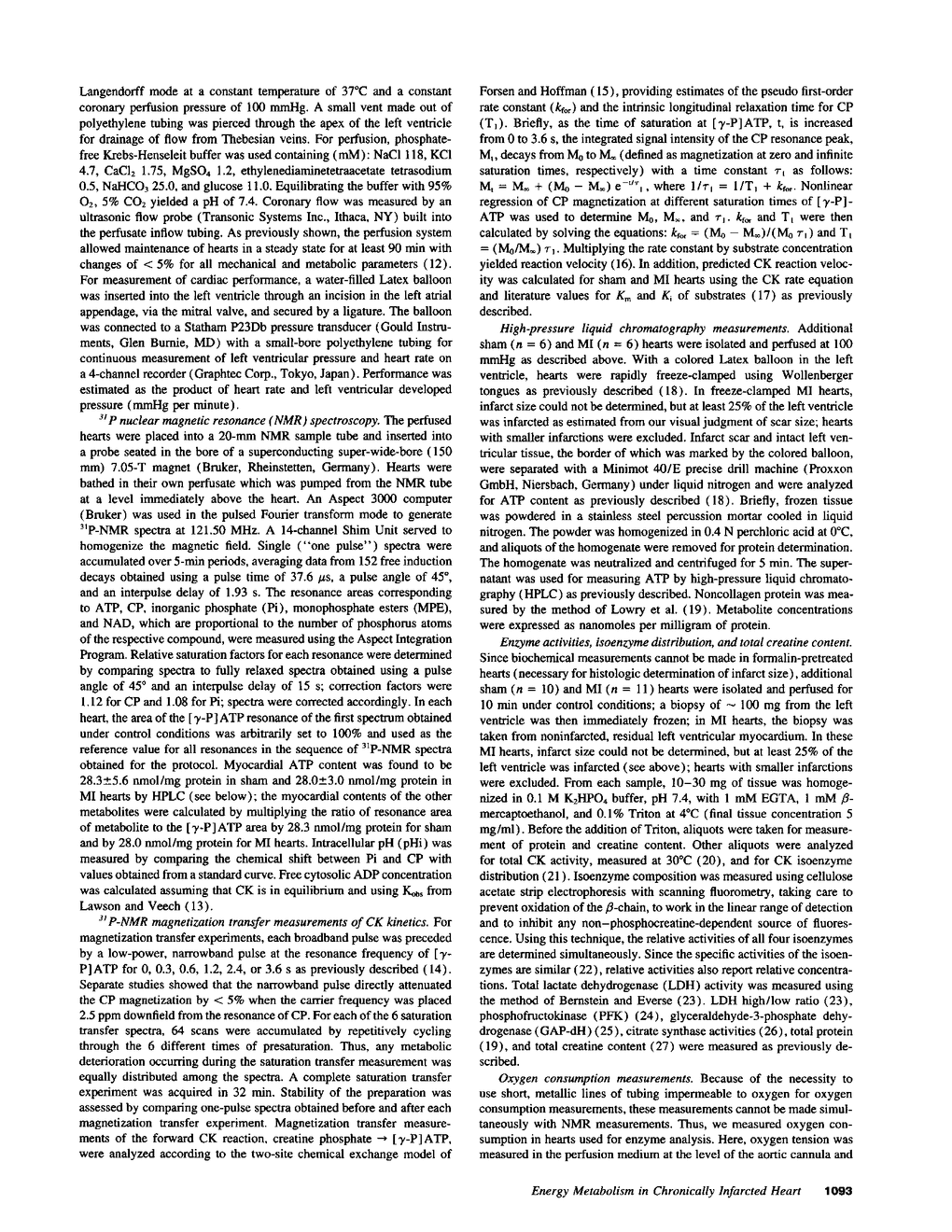 The purpose of this study was to test the hypothesis that energy metabolism is impaired in residual intact myocardium of chronically infarcted rat heart, contributing to contractile dysfunction. Myocardial infarction (MI) was induced in rats by coronary artery ligation. Hearts were isolated 8 wk later and buffer-perfused isovolumically. MI hearts showed reduced left ventricular developed pressure, but oxygen consumption was unchanged. High-energy phosphate contents were measured chemically and by 31P-NMR spectroscopy. In residual intact left ventricular tissue, ATP was unchanged after MI, while creatine phosphate was reduced by 31%. Total creatine kinase (CK) activity was reduced by 17%, the fetal CK isoenzymes BB and MB increased, while the "adult" mitochondrial CK isoenzyme activity decreased by 44%. Total creatine content decreased by 35%. Phosphoryl exchange between ATP and creatine phosphate, measured by 31P-NMR magnetization transfer, fell by 50% in MI hearts. Thus, energy reserve is substantially impaired in residual intact myocardium of chronically infarcted rats. Because phosphoryl exchange was still five times higher than ATP synthesis rates calculated from oxygen consumption, phosphoryl transfer via CK may not limit baseline contractile performance 2 mo after MI. In contrast, when MI hearts were subjected to acute stress (hypoxia), mechanical recovery during reoxygenation was impaired, suggesting that reduced energy reserve contributes to increased susceptibility of MI hearts to acute metabolic stress.