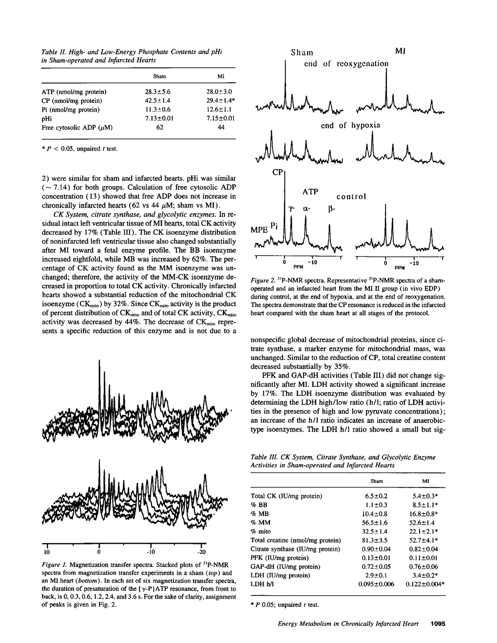 The purpose of this study was to test the hypothesis that energy metabolism is impaired in residual intact myocardium of chronically infarcted rat heart, contributing to contractile dysfunction. Myocardial infarction (MI) was induced in rats by coronary artery ligation. Hearts were isolated 8 wk later and buffer-perfused isovolumically. MI hearts showed reduced left ventricular developed pressure, but oxygen consumption was unchanged. High-energy phosphate contents were measured chemically and by 31P-NMR spectroscopy. In residual intact left ventricular tissue, ATP was unchanged after MI, while creatine phosphate was reduced by 31%. Total creatine kinase (CK) activity was reduced by 17%, the fetal CK isoenzymes BB and MB increased, while the "adult" mitochondrial CK isoenzyme activity decreased by 44%. Total creatine content decreased by 35%. Phosphoryl exchange between ATP and creatine phosphate, measured by 31P-NMR magnetization transfer, fell by 50% in MI hearts. Thus, energy reserve is substantially impaired in residual intact myocardium of chronically infarcted rats. Because phosphoryl exchange was still five times higher than ATP synthesis rates calculated from oxygen consumption, phosphoryl transfer via CK may not limit baseline contractile performance 2 mo after MI. In contrast, when MI hearts were subjected to acute stress (hypoxia), mechanical recovery during reoxygenation was impaired, suggesting that reduced energy reserve contributes to increased susceptibility of MI hearts to acute metabolic stress.