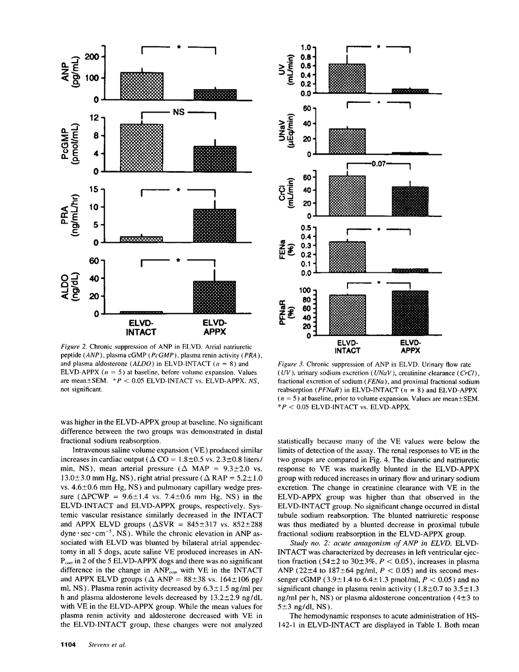 Asymptomatic or early left ventricular dysfunction in humans is characterized by increases in circulating atrial natriuretic peptide (ANP) without activation of the renin-angiotensin-aldosterone system (RAAS). We previously reported a canine model of early left ventricular dysfunction (ELVD) produced by rapid ventricular pacing and characterized by an identical neurohumoral profile and maintenance of the natriuretic response to volume expansion (VE). To test the hypothesis that elevated endogenous ANP suppresses the RAAS and maintains sodium excretion in ELVD, we assessed the effects of antagonism of ANP on cardiorenal and neurohumoral function in ELVD. Chronic ANP suppression was produced by bilateral atrial appendectomies before the production of ELVD by rapid ventricular pacing (ELVD-APPX, n = 5). This group was compared with a separate group with ELVD and intact atrial appendages (ELVD-INTACT, n = 8). ELVD-APPX was characterized by lower circulating ANP (50 +/- 11 vs. 158 +/- 37 pg/ml, P < 0.05), activation of plasma renin activity (PRA) (9.4 +/- 2.4 vs. 0.6 +/- 0.4 ng/ml per h, P < 0.05) and aldosterone (36.4 +/- 12.5 vs. 2.5 +/- 0.0 ng/dl, P < 0.05) when compared to ELVD-INTACT. In comparison to the ELVD-INTACT group, sodium excretion was decreased before and during VE in the ELVD-APPX group. Acute ANP antagonism was produced by administration of the particulate guanylate cyclase coupled natriuretic peptide receptor antagonist, HS-142-1, to seven conscious dogs with ELVD and intact atrial appendages (ELVD-INTACT). HS-142-1 decreased plasma concentrations and renal generation of the ANP second messenger, cGMP, and was associated with activation of PRA and sodium retention with enhanced tubular sodium reabsorption. These data support a significant role for elevated endogenous ANP in the maintenance of sodium excretion and regulation of the RAAS in experimental ELVD.