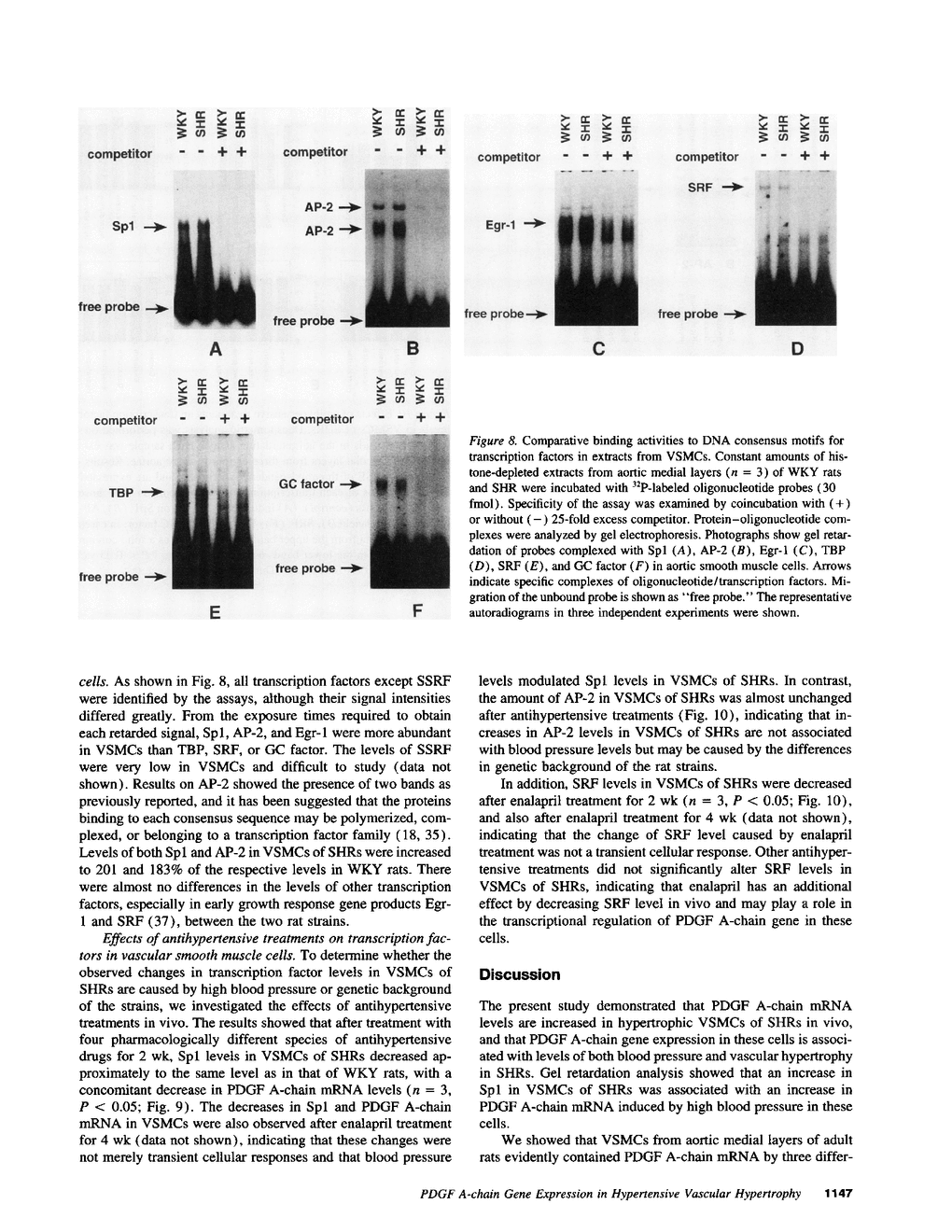 To clarify the role of PDGF A-chain in hypertensive vascular hypertrophy of spontaneously hypertensive rats (SHRs), we studied levels of PDGF A-chain gene expression and transcription factors related to the gene in vascular smooth muscle cells (VSMCs) of SHRs in vivo. RNase protection assay and in situ hybridization showed that PDGF A-chain mRNA levels in VSMCs of SHRs were twofold higher than in those of normotensive Wistar-Kyoto rats. Gel retardation assays showed that levels of Sp1 and AP-2 in VSMCs of SHRs were twofold more abundant than in those of Wistar-Kyoto rats. Treatment with four pharmacologically different species of antihypertensive drugs for 2 wk decreased the levels of both PDGF A-chain mRNA and Sp1, but not AP-2 level in VSMCs of SHRs with regression of aortic hypertrophy, indicating that increases in levels of both PDGF A-chain mRNA and Sp1 in VSMCs of SHRs were associated with high blood pressure. These results suggest that high blood pressure is a stimulus which upregulates PDGF A-chain gene expression in VSMCs of SHRs, resulting in an autocrine enhancement in hypertensive vascular hypertrophy, and that the activation of the gene may be mediated through increases in Sp1 in these cells.