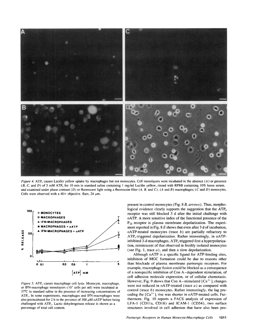 We have investigated responses of human monocyte/macrophage cells to extracellular ATP (ATPe). Freshly isolated peripheral blood monocytes showed responses linked to P2Y but not P2Z purinergic receptors; however, during in vitro macrophage differentiation, these cells also exhibited responses suggestive of the presence of the membrane-permeabilizing P2Z receptor. In fact, in human macrophages a brief (15-min) exposure to ATPe, but not other nucleotides, caused (1) a rapid and long-lasting plasma membrane depolarization; (2) a large increase in intracellular Ca2+ concentration followed by efflux of the Ca2+ indicator; (3) uptake of low molecular weight hydrophilic molecules such as Lucifer yellow and ethidium bromide; and (4) cell rounding, swelling, and eventual release of the cytoplasmic enzyme lactate dehydrogenase. rIFN-gamma enhanced both membrane-permeabilizing and cytotoxic ATPe effects. Membrane permeabilization and cytotoxicity were fully blocked by pretreatment of the cells with oxidized ATP, a compound recently shown to block P2Z receptors covalently in macrophages. Blocking of the P2Z receptor by oxidized ATP also inhibited multinucleated giant cell generation stimulated by concanavalin A or rIFN-gamma without decreasing monocyte migration or membrane adhesion molecule expression. These data suggest that human macrophages express rIFN-gamma-modulated purinergic P2Z receptors in vitro and hint at a role for these plasma membrane molecules in the generation of macrophage polykarions.