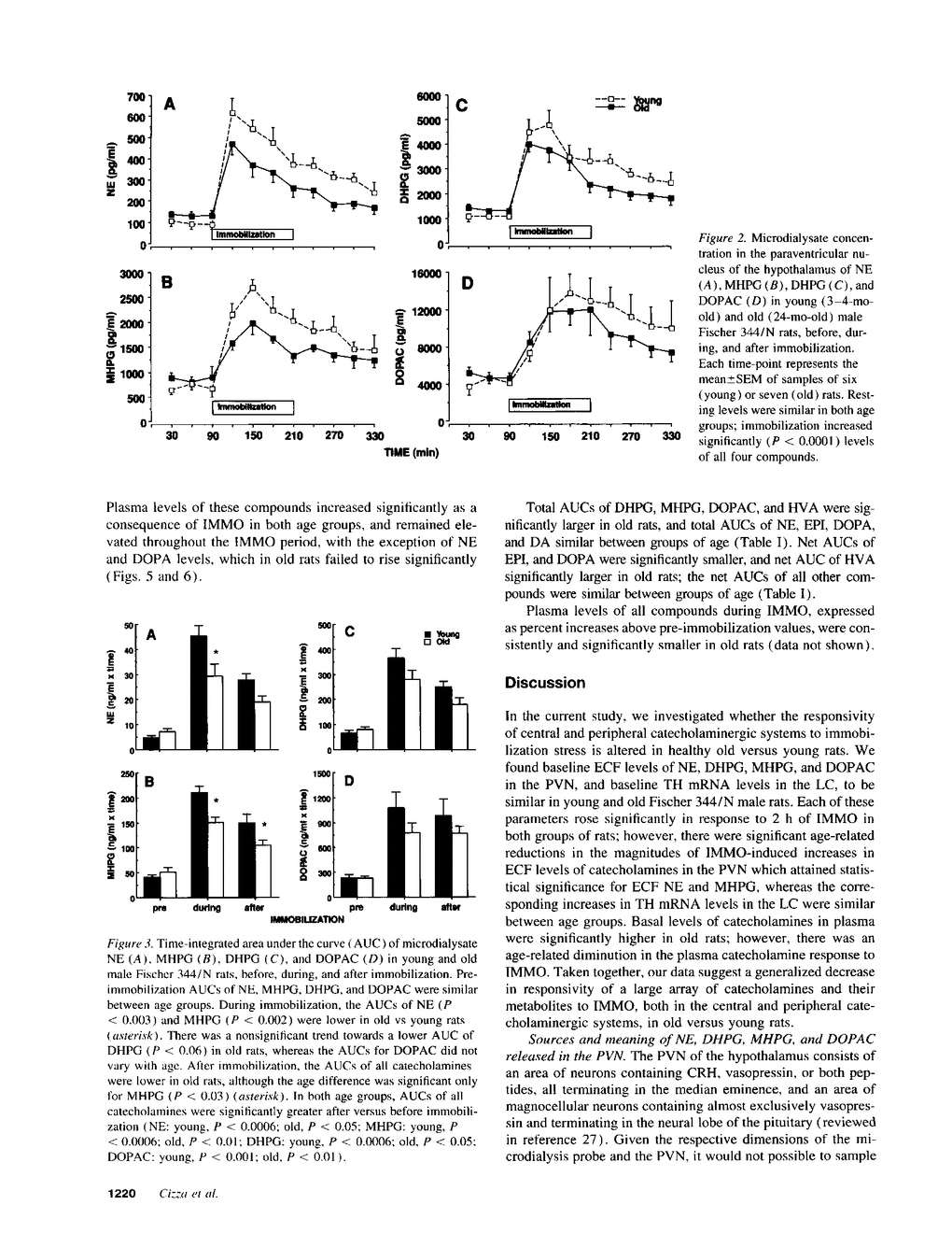 We investigated the effects of stress on central and peripheral sympatho-adrenal and sympatho-neural functions in healthy, intact young (3-4 mo) and aged (24 mo) male Fischer 344/N rats. Extracellular fluid (ECF) levels of the catecholamines norepinephrine (NE), dihydroxyphenylglycol (DHPG), methoxyhydroxyphenylglycol (MHPG), and dihydroxyphenylacetic acid (DOPAC) were obtained by microdialysis in the paraventricular nucleus (PVN) of the hypothalamus at baseline and during immobilization (IMMO). The baseline levels of these substances were similar in both age groups, and their concentrations increased significantly in response to IMMO. The IMMO-induced increases of NE and MHPG, however, were significantly smaller in old than in young rats. Plasma levels of the catecholamines NE, DHPG, MHPG, DOPAC, dihydroxyphenylalanine (DOPA), epinephrine (EPI), dopamine (DA), and HVA were also determined in young and old rats during IMMO. Basal levels of these substances were significantly higher in old than in young rats. The magnitude of the IMMO-induced increases in the majority of these compounds however, was significantly smaller in old than in young rats. We conclude that, at the basal state, aging in the Fischer rat is associated with normal PVN ECF, but high plasma catecholamine levels; at stress state, however, old rats have substantially lesser activation of their central and peripheral catecholaminergic systems than young rats.