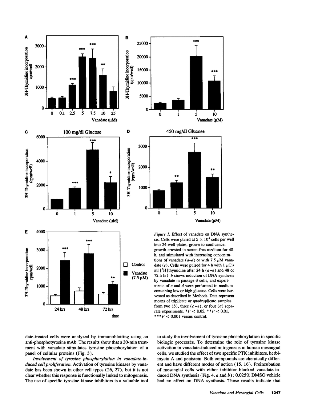 The metalion vanadate has insulin-like effects and has been advocated for use in humans as a therapeutic modality for diabetes mellitus. However, since vanadate is a tyrosine phosphatase inhibitor, it may result in undesirable activation of target cells. We studied the effect of vanadate on human mesangial cells, an important target in diabetic nephropathy. Vanadate stimulated DNA synthesis and PDGF B chain gene expression. Vanadate also inhibited total tyrosine phosphatase activity and stimulated tyrosine phosphorylation of a set of cellular proteins. Two chemically and mechanistically dissimilar tyrosine kinase inhibitors, genistein and herbimycin A, blocked DNA synthesis induced by vanadate. Vanadate also stimulated phospholipase C and protein kinase C. Downregulation of protein kinase C abolished vanadate-induced DNA synthesis. Thus, vanadate-induced mitogenesis is dependent on tyrosine kinases and protein kinase C activation. The most likely mechanism for the effect of vanadate on these diverse processes involves the inhibition of cellular phosphotyrosine phosphatases. These studies demonstrating that vanadate activates mesangial cells may have major implications for the therapeutic potential of vanadate administration in diabetes. Although vanadate exerts beneficial insulin-like effects and potentiates the effect of insulin in sensitive tissue, it may result in undesirable activation of other target cells, such as mesangial cells.
