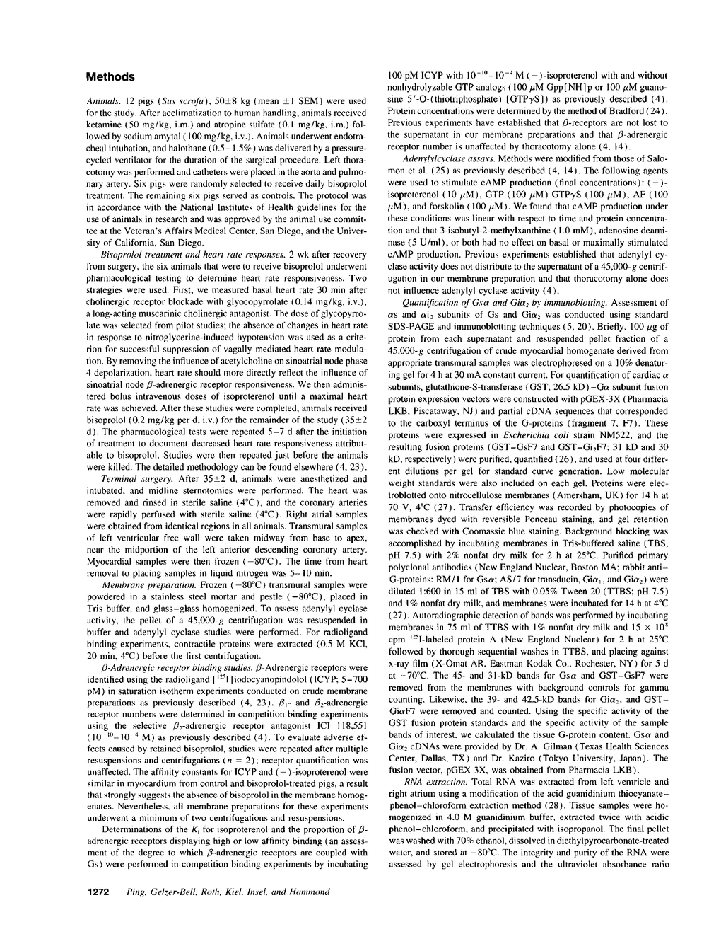 To determine whether beta-adrenergic receptor agonist activation influences guanosine 5'-triphosphate-binding protein (G-protein) expression and beta-adrenergic receptor kinase activity in the heart, we examined the effects of chronic beta 1-adrenergic receptor antagonist treatment (bisoprolol, 0.2 mg/kg per d i.v., 35 d) on components of the myocardial beta-adrenergic receptor-G-protein-adenylyl cyclase pathway in porcine myocardium. Three novel alterations in cardiac adrenergic signaling associated with chronic reduction in beta-adrenergic receptor agonist activation were found. First, there was coordinate downregulation of Gi alpha 2 and Gs alpha mRNA and protein expression in the left ventricle; reduced G-protein content was also found in the right atrium. Second, in the left ventricle, there was a twofold increase in beta-adrenergic receptor-dependent stimulation of adenylyl cyclase and a persistent high affinity state of the beta-adrenergic receptor. Finally, there was a reduction in left ventricular beta-adrenergic receptor kinase activity, suggesting a previously unrecognized association between the degree of adrenergic activation and myocardial beta-adrenergic receptor kinase expression. The heart appears to adapt in response to chronic beta-adrenergic receptor antagonist administration in a manner that would be expected to offset reduced agonist stimulation. The mechanisms for achieving this extend beyond beta-adrenergic receptor upregulation and include alterations in G-protein expression, beta-adrenergic receptor-Gs interaction, and myocardial beta-adrenergic receptor kinase activity.