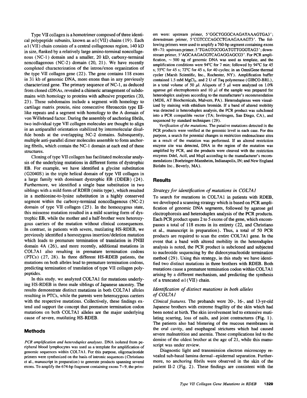 Epidermolysis bullosa (EB) is a group of heritable mechano-bullous skin diseases classified into three major categories on the basis of the level of tissue separation within the dermal-epidermal basement membrane zone. In the most severe, dystrophic (scarring) forms of EB, blisters form below the cutaneous basement membrane at the level of the anchoring fibrils, which are composed of type VII collagen. Ultrastructural observations of altered anchoring fibrils and genetic linkage to the type VII collagen locus (COL7A1) have implicated COL7A1 as the candidate gene in the dystrophic forms of EB. We have recently cloned the entire cDNA and the gene for human COL7A1. In this study, we describe distinct mutations in both COL7A1 alleles in three brothers with severe, mutilating recessive dystrophic EB (the Hallopeau-Siemens type, HS-RDEB). The patients are compound heterozygotes for two different mutations, both of which result in a premature termination codon in COL7A1, and the parents were shown to be clinically heterozygous carries of the respective mutations. Premature termination codons in both alleles of COL7A1 appear to be the underlying cause of severe, recessive dystrophic EB in this family.
