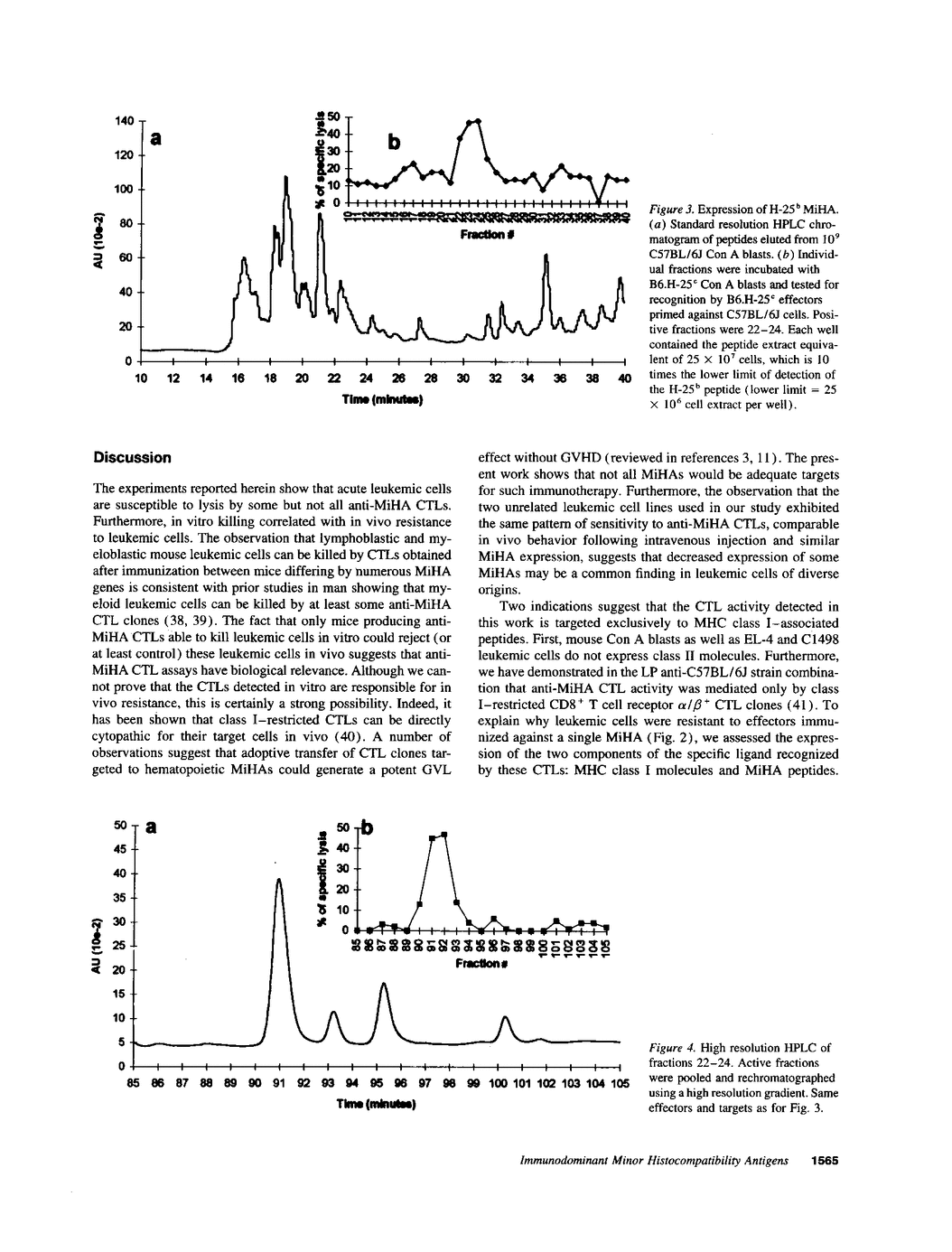 Numerous minor histocompatibility antigens (MiHAs) show tissue-specific expression and can induce vigorous T cell responses. They therefore represent attractive targets for leukemia immunotherapy mediated by adoptive transfer of T cells. The main objective of this work was to determine whether MiHAs expressed by normal hematopoietic cells were present on leukemic cells and whether they could trigger lysis by cytotoxic T lymphocytes (CTLs). CTL assays showed that mouse leukemic cells of both lymphoid and myeloid lineages were sensitive to CTLs targeted toward some but not all MiHAs. In four out of four strain combinations in which we primed CTLs against immunodominant MiHAs, effectors killed leukemic blasts, whereas no cytotoxicity was observed when CTLs were targeted toward four immunorecessive MiHAs. Testing of HPLC fractions obtained from normal and leukemic cells provided molecular evidence that leukemic blasts expressed only some of the MiHAs found on normal mouse hematopoietic cells. Decreased density of H-2 class I molecules at the surface of leukemic cells suggests that down-regulation of genes encoding either class I molecules or proteins involved in antigen processing played a role in the aberrant expression of MiHAs. In vivo resistance to the leukemic cells by various strains of mice correlated with in vitro CTL activity. These results show that leukemic cells express only some (immunodominant) MiHAs and suggest that this subset of MiHAs represent prime targets for adoptive immunotherapy.