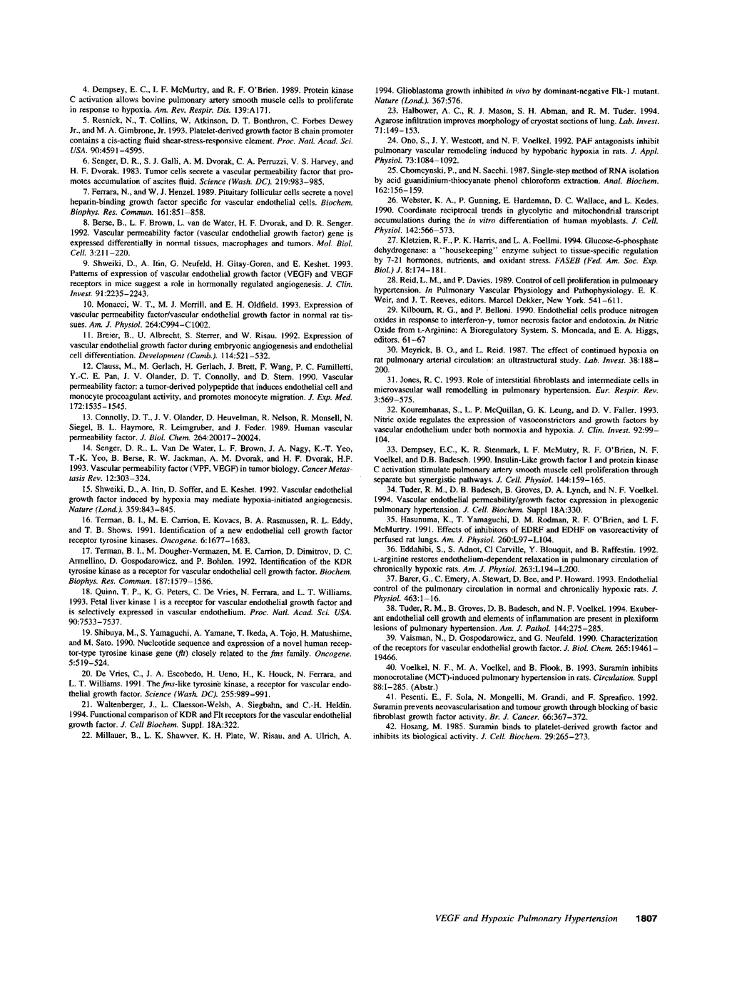 Endothelial cells constitute an essential integrator of factors that effect blood vessel remodeling induced by chronic hypoxia. We hypothesized that vascular endothelial growth factor (VEGF) may participate in the lung response to acute and to chronic hypoxia. We found that ex vivo perfusion of isolated lungs under hypoxic conditions (when compared with normoxia) caused an increase in lung tissue mRNA of VEGF and of the VEGF receptors KDR/Flk and Flt. Chronic hypobaric hypoxia also increased lung tissue mRNA levels of VEGF, KDR/Flk, and Flt and the amount of VEGF protein. In situ hybridization studies demonstrated increased VEGF and KDR/flk hybridization signals in lungs from chronically hypoxic rats. Since endotoxin treatment of rats decreased lung VEGF mRNA, we postulated that nitric oxide (NO) or an NO-related metabolite might be involved in lung VEGF gene expression. Indeed, sodium nitroprusside, a NO donor, decreased and L-NAME (N-nitro-L-arginine methyl ester), an inhibitor of NO-synthesis, increased both VEGF and VEGF receptor transcripts. We conclude that VEGF in the isolated perfused lung acts as an early gene in response to hypoxia and that lung VEGF and VEGF receptor mRNA levels are influenced by hypoxia and NO-dependent mechanisms.