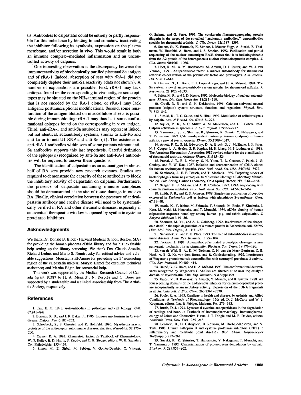 RA is the most frequent and most destructive inflammatory arthropathy. Rheumatoid factors, in spite of their lack of disease specificity, are important serological markers for RA and appear important in its immunopathogenesis as well. In search of more disease-specific autoimmune systems, we have screened a human placenta lambda gt11 cDNA expression library using selected sera from patients with classical erosive RA. We have identified one clone (RA-1) that is recognized by three of five screening sera. The 950-bp insert shows a complete nucleotide sequence homology to the cDNA encoding the two COOH-terminal domains of calpastatin. The deduced open reading frame of the RA-1 cDNA predicts a 284-amino acid protein, with a calculated mol wt of 35.9 kD. Calpastatin is the natural inhibitor of calpains, which are members of the cysteine proteinases recently implicated in joint destruction in rheumatic diseases. The two domains encoded by the RA-1 clone each contain the structural features associated with the inhibitory activity of human calpastatin. By Western blotting, 45.5% or 21/44 RA sera specifically recognized both the fusion and the cleaved recombinant protein. This is in contrast to 4.7% (2/43) in nonrheumatoid sera and 0/10 in normal sera. Anticalpastatin autoantibodies could represent a disease-associated marker in chronic erosive arthritis of the rheumatoid type and could hypothetically play a dual pathogenic role, directly via an immune interference and indirectly through an immune complex mechanism.