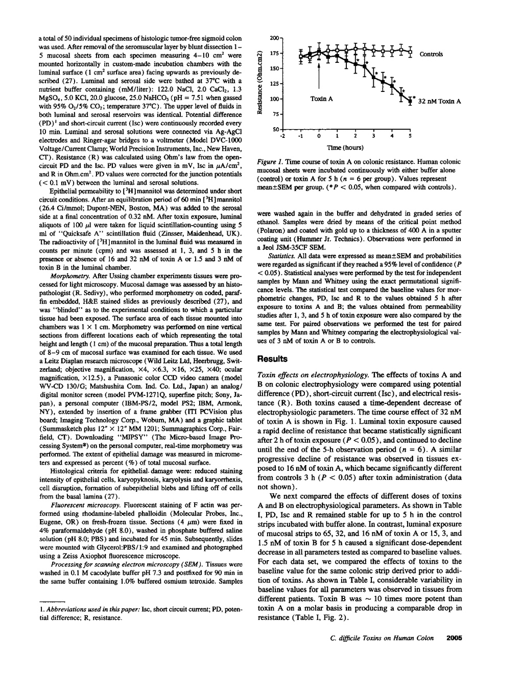 Toxin A but not toxin B, appears to mediate intestinal damage in animal models of Clostridium difficile enteritis. The purpose of this study was to investigate the electrophysiologic and morphologic effects of purified C. difficile toxins A and B on human colonic mucosa in Ussing chambers. Luminal exposure of tissues to 16-65 nM of toxin A and 0.2-29 nM of toxin B for 5 h caused dose-dependent epithelial damage. Potential difference, short-circuit current and resistance decreased by 76, 58, and 46%, respectively, with 32 nM of toxin A and by 76, 55, and 47%, respectively, with 3 nM of toxin B, when compared with baseline (P < 0.05). 3 nM of toxin A did not cause electrophysiologic changes. Permeability to [3H]mannitol increased 16-fold after exposure to 32 nM of toxin A and to 3 nM of toxin B when compared with controls (P < 0.05). Light and scanning electron microscopy after exposure to either toxin revealed patchy damage and exfoliation of superficial epithelial cells, while crypt epithelium remained intact. Fluorescent microscopy of phalloidin-stained sections showed that both toxins caused disruption and condensation of cellular F-actin. Our results demonstrate that the human colon is approximately 10 times more sensitive to the damaging effects of toxin B than toxin A, suggesting that toxin B may be more important than toxin A in the pathogenesis of C. difficile colitis in man.