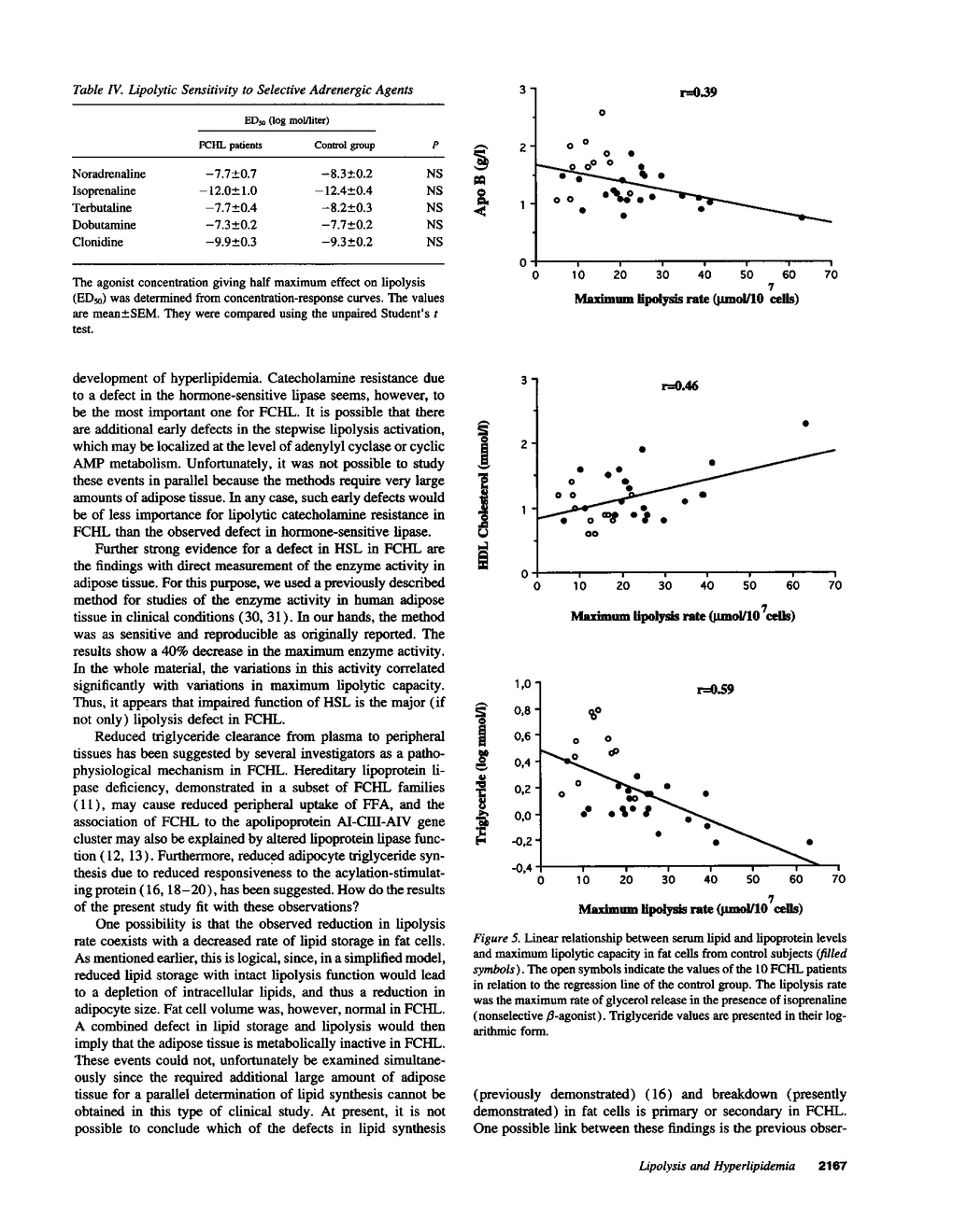 The pathophysiology of familial combined hyperlipidemia (FCHL) is unknown, but altered lipid turnover in peripheral tissues as well as hepatic overproduction of apolipoprotein B have been suggested as possible causes. In the present study, we explored whether a change in triglyceride breakdown by lipolysis in fat cells is present in FCHL. Lipolysis activation by catecholamines was examined in isolated subcutaneous adipocytes from 10 patients with FCHL and 22 healthy control subjects. Lipolysis rate was linear for at least 3 h in both groups. However, a marked (approximately 65%) decrease in the lipolytic response to noradrenaline was found in FCHL. This was also true when lipolysis was maximally stimulated at the receptor level with isoprenaline (nonselective beta-adrenergic agonist), at the adenylyl cyclase level with forskolin, or at the level of the protein kinase hormone-sensitive lipase complex with dibutyryl cAMP. The maximum enzymatic activity of hormone-sensitive lipase was decreased by approximately 40% in FCHL. On the other hand, the lipolytic sensitivity of alpha 2-, beta 1-, and beta 2-adrenoceptors was normal in this condition, as was the number and affinity of beta 1- and beta 2-adrenoceptors. Variations in the maximum lipolysis rate correlated significantly with the variations in hormone-sensitive lipase activity in the whole material, and with the serum values for triglycerides, HDL cholesterol and apoB lipoprotein within the control group, but the serum triglyceride values in FCHL were higher than this correlation predicted. In conclusion, the data demonstrate a marked resistance to the lipolytic effect of catecholamines in fat cells from patients with FCHL, in spite of normal adrenoceptor function. The lipolytic defect appears predominantly to be due to a defect in hormone-sensitive lipase, and may be of importance in the pathophysiology of FCHL.