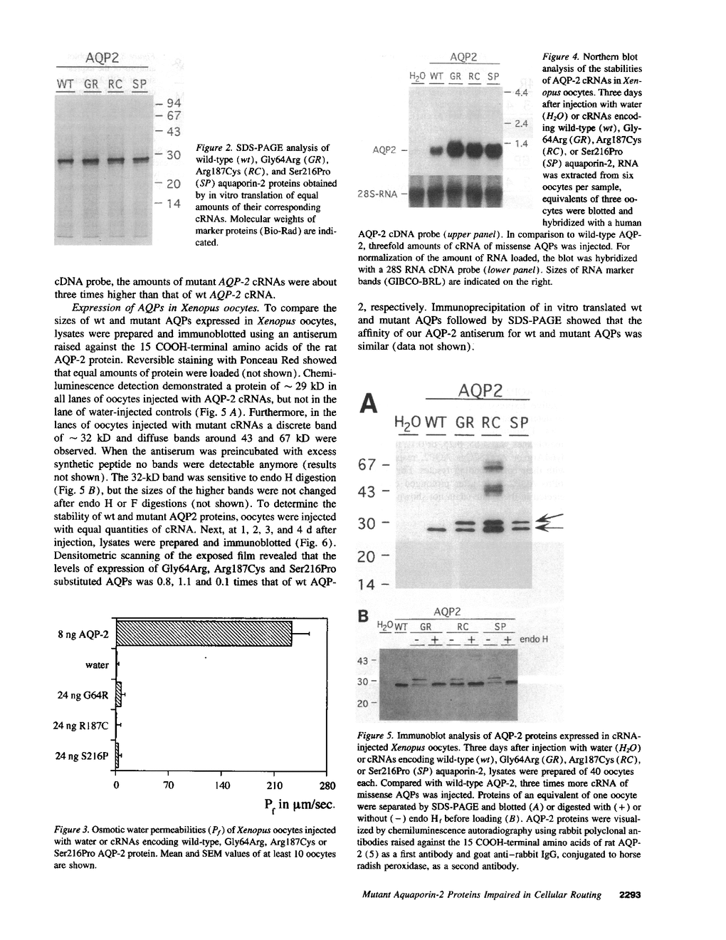 Congenital nephrogenic diabetes insipidus is a recessive hereditary disorder characterized by the inability of the kidney to concentrate urine in response to vasopressin. Recently, we reported mutations in the gene encoding the water channel of the collecting duct, aquaporin-2 (AQP-2) causing an autosomal recessive form of nephrogenic diabetes insipidus (NDI). Expression of these mutant AQP-2 proteins (Gly64Arg, Arg187Cys, Ser216Pro) in Xenopus oocytes revealed nonfunctional water channels. Here we report further studies into the inability of these missense AQP-2 proteins to facilitate water transport in Xenopus oocytes. cRNAs encoding the missense AQPs were translated with equal efficiency as cRNAs encoding wild-type AQP-2 and were equally stable. Arg187Cys AQP2 was more stable and Gly6-4Arg and Ser216Pro AQP2 were less stable when compared to wild-type AQP2 protein. On immunoblots, oocytes expressing missense AQP-2 showed, besides the wild-type 29 kDa band, an endoplasmic reticulum-retarded form of AQP-2 of approximately 32 kD. Immunoblots and immunocytochemistry demonstrated only intense labeling of the plasma membranes of oocytes expressing wild-type AQP-2. Therefore, we conclude that in Xenopus oocytes the inability of Gly64-Arg, Arg187Cys or Ser216Pro substituted AQP-2 proteins to facilitate water transport is caused by an impaired routing to the plasma membrane.