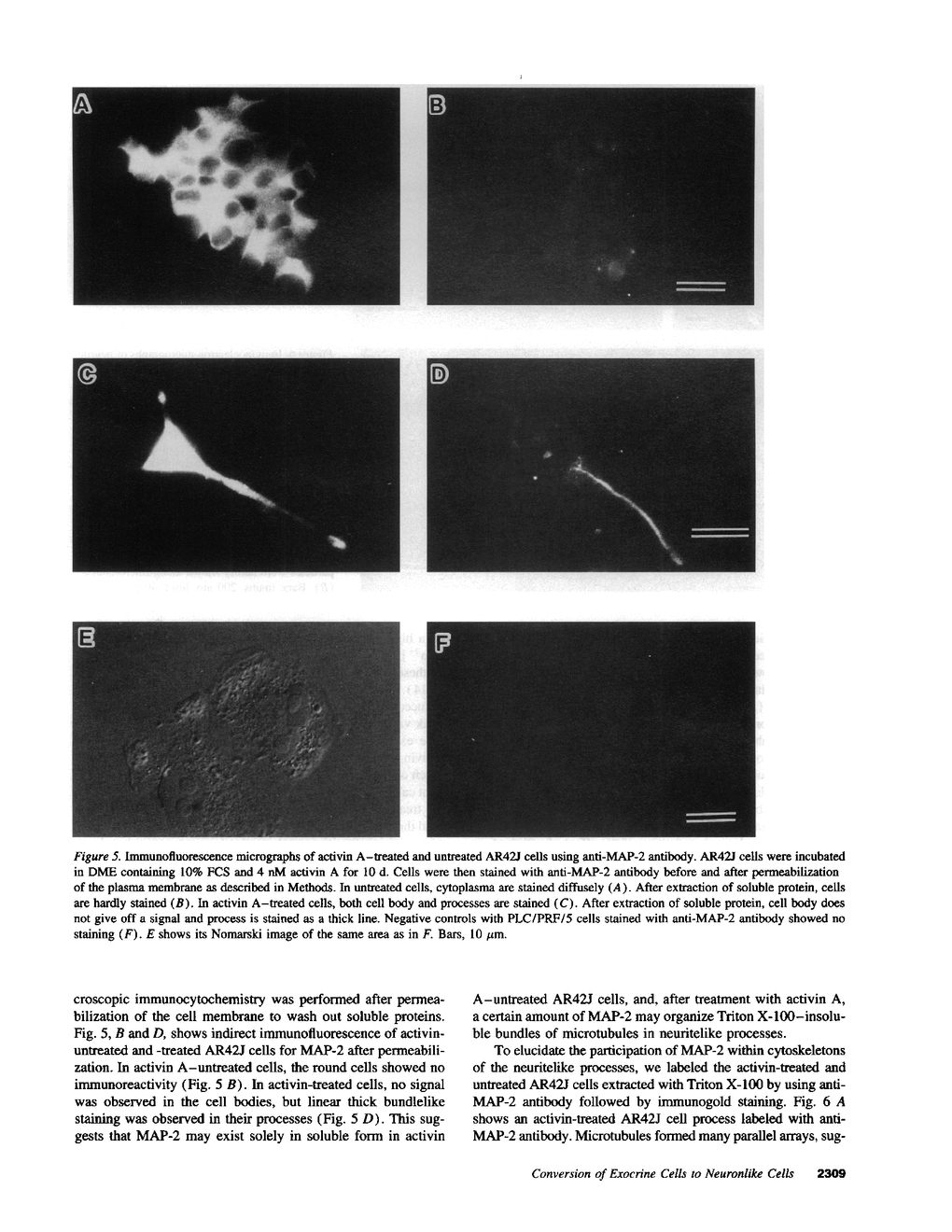 When AR42J cells, an amylase-secreting pancreatic exocrine cell line, were treated with activin A, cells extended neuritelike processes, and, concomitantly, amylase-containing vesicles disappeared. Immunofluorescence and immunoelectron microscopy revealed that these processes had neurite-specific cytoskeletal architectures: neurofilaments and microtubule bundles with cross-bridges of microtubule-associated protein 2. In addition to such morphological changes, activin-treated cells exhibited a marked increase in cytoplasmic free calcium concentration in response to depolarizing concentration of potassium. Moreover, activin-treated AR42J cells expressed mRNA for alpha 1 subunit of the neuroendocrine/beta cell-type voltage-dependent calcium channel. In naive AR42J cells, a sulfonylurea compound, tolbutamide, did not affect free calcium concentration, while it induced a marked elevation of free calcium in activin-treated cells. Single channel recording of the membrane patch revealed the existence of ATP-sensitive potassium channel in activin-treated cells. These results indicate that activin A converts amylase-secreting AR42J cells to neuronlike cells. Given that pancreatic endocrine cells possess neuronlike properties and express ATP-sensitive potassium channel as well as neuroendocrine/beta cell-type voltage-dependent calcium channel, activin treatment of AR42J cells may provide an in vitro model system to study the conversion of pancreatic exocrine cells to endocrine cells in islets.