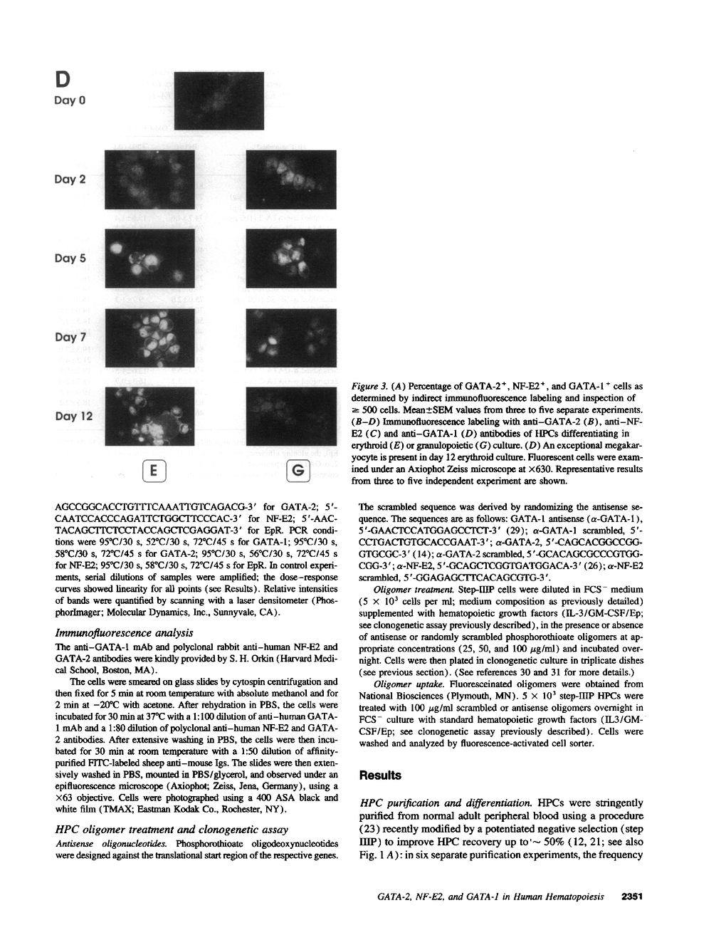 We have explored the expression of the transcription factors GATA-1, GATA-2, and NF-E2 in purified early hematopoietic progenitor cells (HPCs) induced to gradual unilineage erythroid or granulocytic differentiation by growth factor stimulus. GATA-2 mRNA and protein, already expressed in quiescent HPCs, is rapidly induced as early as 3 h after growth factor stimulus, but then declines in advanced erythroid and granulocytic differentiation and maturation. NF-E2 and GATA-1 mRNAs and proteins, though not detected in quiescent HPCs, are gradually induced at 24-48 h in both erythroid and granulocytic culture. Beginning at late differentiation/early maturation stage, both transcription factors are further accumulated in the erythroid pathway, whereas they are suppressed in the granulopoietic series. Similarly, the erythropoietin receptor (EpR) is induced and sustainedly expressed during erythroid differentiation, although beginning at later times (i.e., day 5), whereas it is barely expressed in the granulopoietic pathway. In the first series of functional studies, HPCs were treated with antisense oligomers targeted to transcription factor mRNA: inhibition of GATA-2 expression caused a decreased number of both erythroid and granulocyte-monocytic clones, whereas inhibition of NF-E2 or GATA-1 expression induced a selective impairment of erythroid colony formation. In a second series of functional studies, HPCs treated with retinoic acid were induced to shift from erythroid to granulocytic differentiation (Labbaye et al. 1994. Blood. 83:651-656); this was coupled with abrogation of GATA-1, NF-E2, and EpR expression and conversely enhanced GATA-2 levels. These results indicate the expression and key role of GATA-2 in the early stages of HPC proliferation/differentiation. Conversely, NF-E2 and GATA-1 expression and function are apparently restricted to erythroid differentiation and maturation: their expression precedes that of the EpR, and their function may be in part mediated via the EpR.