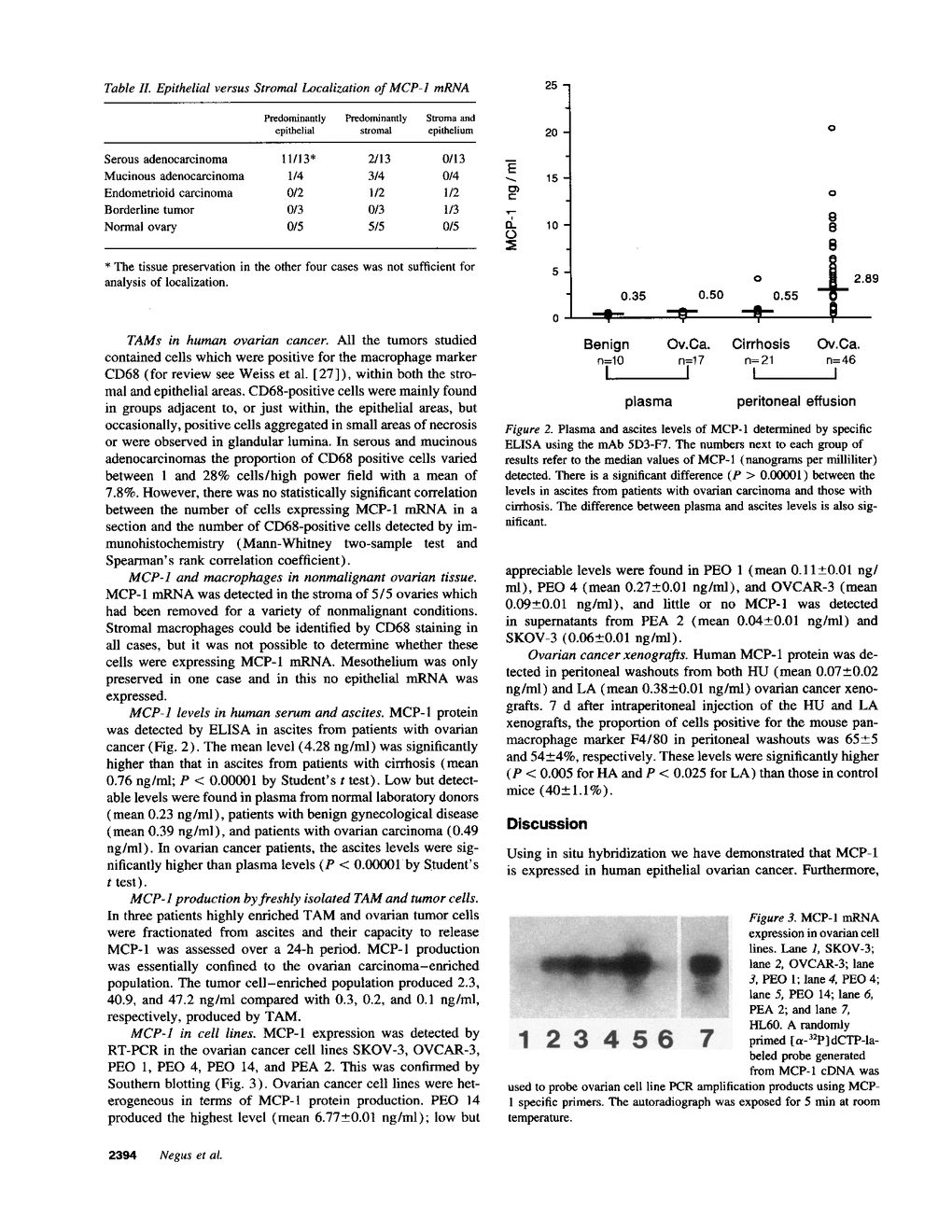 Chemokines may control the macrophage infiltrate found in many solid tumors. In human ovarian cancer, in situ hybridization detected mRNA for the macrophage chemokine monocyte chemoattractant protein-1 (MCP-1) in 16/17 serous carcinomas, 4/4 mucinous carcinomas, 2/2 endometrioid carcinomas, and 1/3 borderline tumors. In serous tumors, mRNA expression mainly localized to the epithelial areas, as did immunoreactive MCP-1 protein. In the other tumors, both stromal and epithelial expression were seen. All tumors contained variable numbers of cells positive for the macrophage marker CD68. MCP-1 mRNA was also detected in the stroma of 5/5 normal ovaries. RT-PCR demonstrated mRNA for MCP-1 in 7/7 serous carcinomas and 6/6 ovarian cancer cell lines. MCP-1 protein was detected by ELISA in ascites from patients with ovarian cancer (mean 4.28 ng/ml) and was produced primarily by the cancer cells. Human MCP-1 protein was also detected in culture supernatants from cell lines and in ascites from human ovarian tumor xenografts which induce a peritoneal monocytosis in nude mice. We conclude that the macrophage chemoattractant MCP-1 is produced by epithelial ovarian cancer and that the tumor cells themselves are probably a major source. MCP-1 may contribute to the accumulation of tumor-associated macrophages, which may subsequently influence tumor behavior.