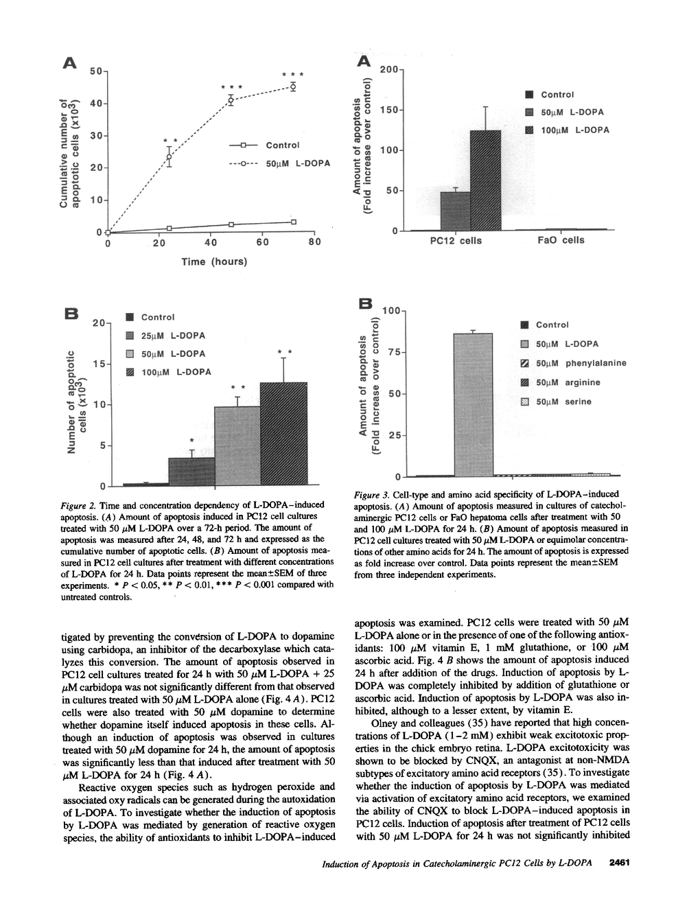 The hypothesis that L-DOPA therapy in Parkinson's disease may augment neuronal damage and thus accelerate the progression of the disease remains controversial. In this study, we demonstrate that L-DOPA induces death of catecholaminergic cells in vitro via an active program of apoptosis. Treatment of PC12 cells with clinically applicable concentrations of L-DOPA (25-100 microM) induced cell death via a mechanism which exhibited morphological and biochemical characteristics of apoptosis, including chromatin condensation, membrane blebbing, and internucleosomal DNA fragmentation. L-DOPA-induced apoptosis was cell and drug-type specific. Toxicity is an intrinsic property of the drug molecule since it was not suppressed by inhibiting conversion of L-DOPA to dopamine. However, L-DOPA toxicity was inhibited by antioxidants, suggesting that activation of apoptosis is mediated by oxygen radicals. Our finding that L-DOPA-induced cell death in vitro occurs via apoptosis explains the lack of evidence supporting its toxicity in vivo, since apoptotic neurons are rapidly phagocytosed in vivo without causing damage to surrounding tissue. Furthermore, since apoptosis is an active cellular program which can be modulated, we suggest clinical approaches for decreasing L-DOPA toxicity, thus preventing acceleration of neuronal damage in Parkinson's disease.