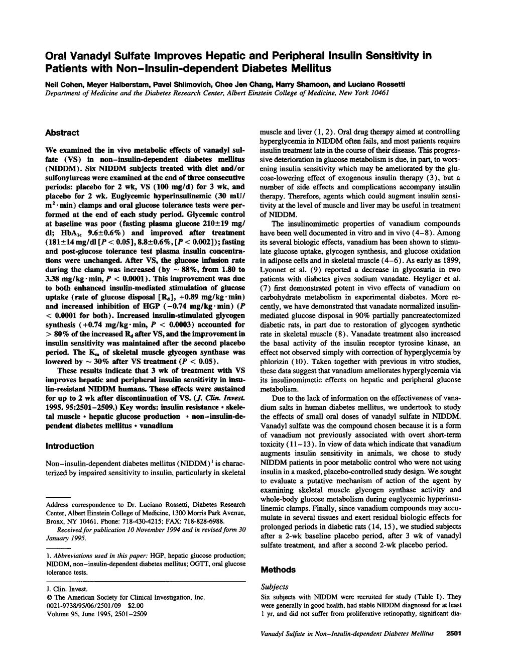 We examined the in vivo metabolic effects of vanadyl sulfate (VS) in non-insulin-dependent diabetes mellitus (NIDDM). Six NIDDM subjects treated with diet and/or sulfonylureas were examined at the end of three consecutive periods: placebo for 2 wk, VS (100 mg/d) for 3 wk, and placebo for 2 wk. Euglycemic hyperinsulinemic (30 mU/m2.min) clamps and oral glucose tolerance tests were performed at the end of each study period. Glycemic control at baseline was poor (fasting plasma glucose 210 +/- 19 mg/dl; HbA1c 9.6 +/- 0.6%) and improved after treatment (181 +/- 14 mg/dl [P < 0.05], 8.8 +/- 0.6%, [P < 0.002]); fasting and post-glucose tolerance test plasma insulin concentrations were unchanged. After VS, the glucose infusion rate during the clamp was increased (by approximately 88%, from 1.80 to 3.38 mg/kg.min, P < 0.0001). This improvement was due to both enhanced insulin-mediated stimulation of glucose uptake (rate of glucose disposal [Rd], +0.89 mg/kg.min) and increased inhibition of HGP (-0.74 mg/kg.min) (P < 0.0001 for both). Increased insulin-stimulated glycogen synthesis (+0.74 mg/kg.min, P < 0.0003) accounted for > 80% of the increased Rd after VS, and the improvement in insulin sensitivity was maintained after the second placebo period. The Km of skeletal muscle glycogen synthase was lowered by approximately 30% after VS treatment (P < 0.05). These results indicate that 3 wk of treatment with VS improves hepatic and peripheral insulin sensitivity in insulin-resistant NIDDM humans. These effects were sustained for up to 2 wk after discontinuation of VS.
