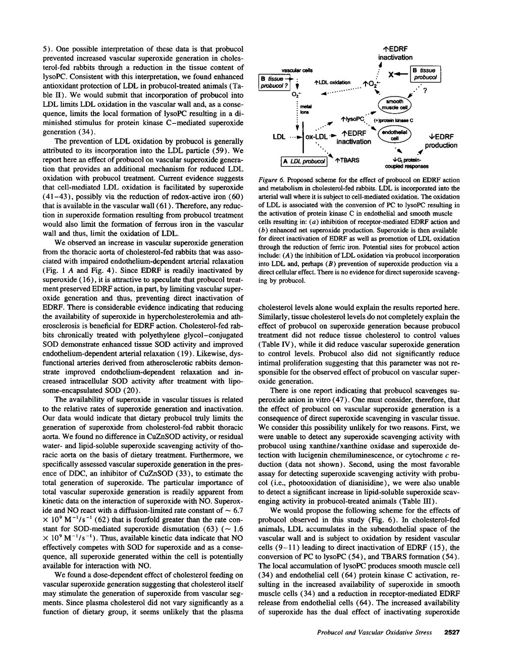 Excess vascular oxidative stress and the local formation of oxidized LDL (ox-LDL) have been implicated in the development of impaired endothelium-dependent arterial relaxation in hypercholesterolemia and atherosclerosis. Dietary antioxidants limit LDL oxidation in vitro and treatment of cholesterol-fed rabbits with dietary antioxidants preserves endothelium-derived relaxing factor (EDRF) action. To investigate the mechanism(s) responsible for these observations, we examined EDRF action, vascular oxidative stress, and antioxidant protection in male New Zealand White rabbits using four dietary treatments. Animals consumed standard chow (chow group) or chow supplemented with: (a) 0.5% cholesterol (0.5% cholesterol group); (b) 1% cholesterol (1% cholesterol group); or (c) 1% cholesterol and 1% probucol (probucol group). After 28 d of dietary treatment, segments of thoracic aorta from the 0.5 and 1% cholesterol groups demonstrated impairment of acetylcholine-mediated endothelium-dependent arterial relaxation compared to chow-fed animals (57 +/- 11% and 45 +/- 9% vs 78 +/- 3%, respectively; P < 0.05). In contrast, vessels from the probucol group demonstrated normal relaxation to acetylcholine (83 +/- 5%). Plasma cholesterol levels and the extent of atherosclerosis were similar among all cholesterol-fed groups. Probucol treatment was associated a threefold increase in LDL resistance to copper-induced oxidative modification (P < 0.05) and a reduction in tissue lipid peroxidation (as assessed by thiobarbituric acid-reactive substances; P < 0.05) compared to animals fed cholesterol alone. Most importantly, both of these changes were strongly correlated with preserved EDRF action. Moreover, cholesterol feeding was associated with a dose-dependent increase in vascular superoxide generation and lysophosphatidylcholine content, both of which were prevented by probucol treatment. From these findings, we conclude that probucol, a lipid-soluble antioxidant, preserves EDRF action in cholesterol-fed rabbits in association with limiting vascular oxidative stress and superoxide generation.