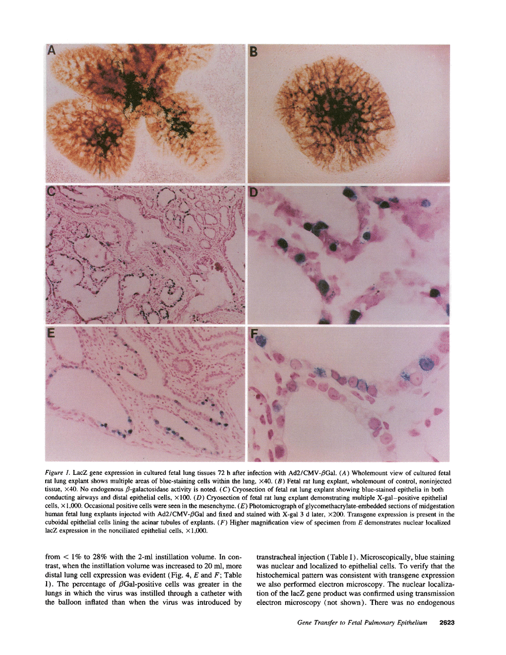 Vector-mediated gene transfer offers a direct method of correcting genetic pulmonary diseases and might also be used to correct temporary abnormalities associated with acquired, nongenetic disorders. Because the fetus or newborn may be a more immune tolerant host for gene transfer using viral vectors, we used replication defective recombinant adenoviral vectors to test the feasibility of gene transfer to the fetal pulmonary epithelium in vitro and in vivo. Both proximal and distal epithelial cells in cultured fetal lung tissues from rodents and humans diffusely expressed the lacZ transgene 3 d after viral infection. In vivo gene delivery experiments were performed in fetal mice and lambs. Delivery of Ad2/CMV-beta Gal to the amniotic fluid in mice produced intense transgene expression in the fetal epidermis and amniotic membranes, some gastrointestinal expression, but no significant airway epithelial expression. When we introduced the adenoviral vector directly into the trachea of fetal lambs, the lacZ gene was expressed in the tracheal, bronchial, and distal pulmonary epithelial cells 3 d after viral infection. Unexpectedly, reactive hyperplasia and squamous metaplasia were noted in epithelia expressing lacZ in the trachea, but not in the distal lung of fetal lambs. 1 wk after infection, adenovirus-treated fetuses developed inflammatory cell infiltrates in the lung tissue with CD4, CD8, IgM, and granulocyte/macrophage positive immune effector cells. Transgene expression faded coincident with inflammation and serologic evidence of antiadenoviral antibody production. While these studies document the feasibility of viral-mediated gene transfer in the prenatal lung, they indicate that immunologic responses to E1-deleted recombinant adenoviruses limit the duration of transgene expression.