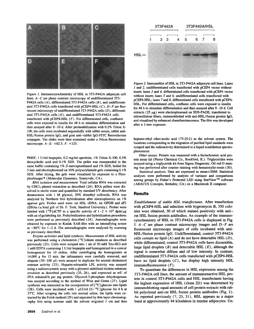 Hormone-sensitive lipase (HSL) is a cytosolic neutral lipase that hydrolyzes intracellular stores of triglycerides within adipocytes and is thought to be the rate limiting enzyme in lipolysis; however, direct evidence to prove this concept has been lacking. The present study was designed to establish the function of HSL in adipocytes. A 2360-bp fragment containing the entire HSL coding region was cloned into the vector pCEP4 and was used to transfect the 3T3-F442A adipogenic cell line. Nondifferentiated, transfected cells were screened for HSL overexpression by indirect immunofluorescence microscopy and confirmed by immunoblotting cell extracts with anti-HSL/fusion protein antibodies and by Northern blots for HSL mRNA. Stable transfectants overexpressing HSL were obtained and cloned. Compared with undifferentiated 3T3-F442A cells transfected with pCEP4 not containing the insert (vector alone) where HSL expression was very low, undifferentiated HSL transfectants had up to a 100-fold increase in HSL activity. Likewise, immunoreactive HSL protein and HSL mRNA levels were increased up to 100-fold in HSL transfectants. When confluent cells were allowed to differentiate by exposure to insulin, HSL expression increased in vector alone transfected cells, but remained below that observed in HSL transfectants. A similar degree of differentiation was seen in both vector alone and HSL transfectants when based on the induction of lipoprotein lipase. Cellular triglyceride content increased dramatically in the vector alone transfected cells while triglyceride content was markedly reduced in the HSL transfectants. The expression of late markers of adipocyte differentiation, such as aP2 and GPDH, was diminished and appeared to vary with the degree to which HSL was overexpressed and the cellular triglyceride content was reduced. Thus, the overexpression of HSL in 3T3-F442A cells prevents differentiated adipocytes from taking on the appearance of fat cells, i.e., accumulating triglyceride. Furthermore, the overexpression of HSL directly or indirectly attenuates the expression of several genes that appear during late adipocyte differentiation.