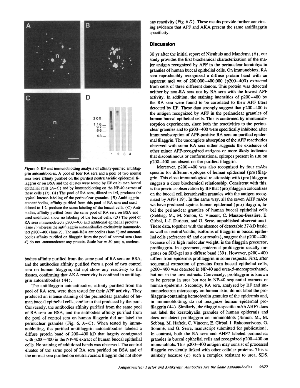 The so-called antikeratin antibodies (AKA) and the antiperinuclear factor (APF) are the most specific serological markers of RA. Using indirect immunofluorescence, AKA label the stratum corneum of various cornified epithelia and APF the keratohyalin granules of human buccal mucosa epithelium. We recently demonstrated that AKA recognize human epidermal filaggrin. Here, we report the identification of the major APF antigen as a diffuse protein band of 200-400 kD. This protein is seen to be closely related to human epidermal (pro) filaggrin since it was recognized by four antifilaggrin mAbs specific for different epitopes, and since the APF titers of RA sera were found to be correlated to their AKA titers and to their immunoblotting reactivities to filaggrin. Immunoabsorption of RA sera on purified epidermal filaggrin abolished their reactivities to the granules of buccal epithelial cells and to the 200-400-kD antigen. Moreover, antifilaggrin autoantibodies, i.e., AKA, affinity purified from RA sera, were shown to immunodetect the 200-400-kD antigen and to stain these granules. These results indicate that AKA and APF are largely the same autoantibodies. They recognize human epidermal filaggrin and (pro) filaggrin-related proteins of buccal epithelial cells. Identification of the epitopes recognized by these autoantibodies, which we propose to name antifilaggrin autoantibodies, will certainly open new paths of research into the pathophysiology of RA.