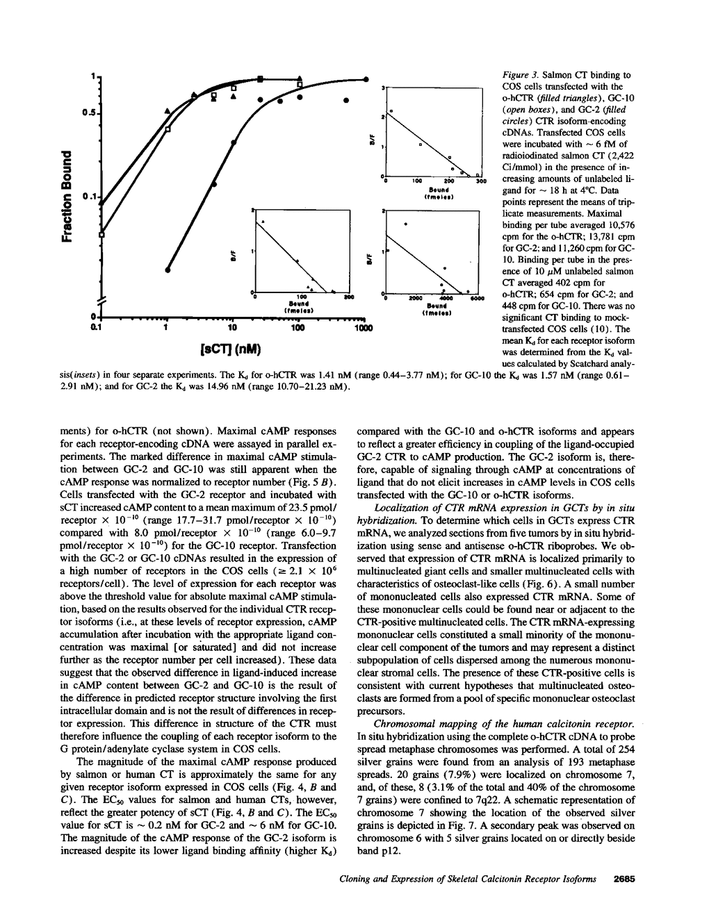 Two distinct calcitonin (CT) receptor (CTR)-encoding cDNAs (designated GC-2 and GC-10) were cloned and characterized from giant cell tumor of bone (GCT). Both GC-2 and GC-10 differ structurally from the human ovarian cell CTR (o-hCTR) that we cloned previously, but differ from each other only by the presence (GC-10) or absence (GC-2) of a predicted 16-amino acid insert in the putative first intracellular domain. Expression of all three CTR isoforms in COS cells demonstrated that GC-2 has a lower binding affinity for salmon (s) CT (Kd approximately 15 nM) than GC-10 or o-hCTR (Kd approximately 1.5 nM). Maximal stimulatory concentrations of CT resulted in a mean accumulation of cAMP in GC-2 transfected cells that was greater than eight times higher than in cells transfected with GC-10 after normalizing for the number of receptor-expressing cells. The marked difference in maximal cAMP response was also apparent after normalizing for receptor number. GC-2 also demonstrated a more potent ligand-mediated cAMP response compared with GC-10 for both human (h) and sCT (the EC50 values for GC-2 were approximately 0.2 nM for sCT and approximately 2 nM for hCT; EC50 values for GC-10 were approximately 6 nM for sCT and approximately 25 nM for hCT). Reverse transcriptase PCR of GCT RNA indicated that GC-2 transcripts are more abundant than those encoding for GC-10. In situ hybridization on GCT tissue sections demonstrated CTR mRNA expression in osteoclast-like cells. We localized the human CTR gene to chromosome 7 in band q22. The distinct functional characteristics of GC-2 and GC-10, which differ in structure only in the first intracellular domain, indicate that the first intracellular domain of the CTR plays a previously unidentified role in modulating ligand binding and signal transduction via the G protein/adenylate cyclase system.