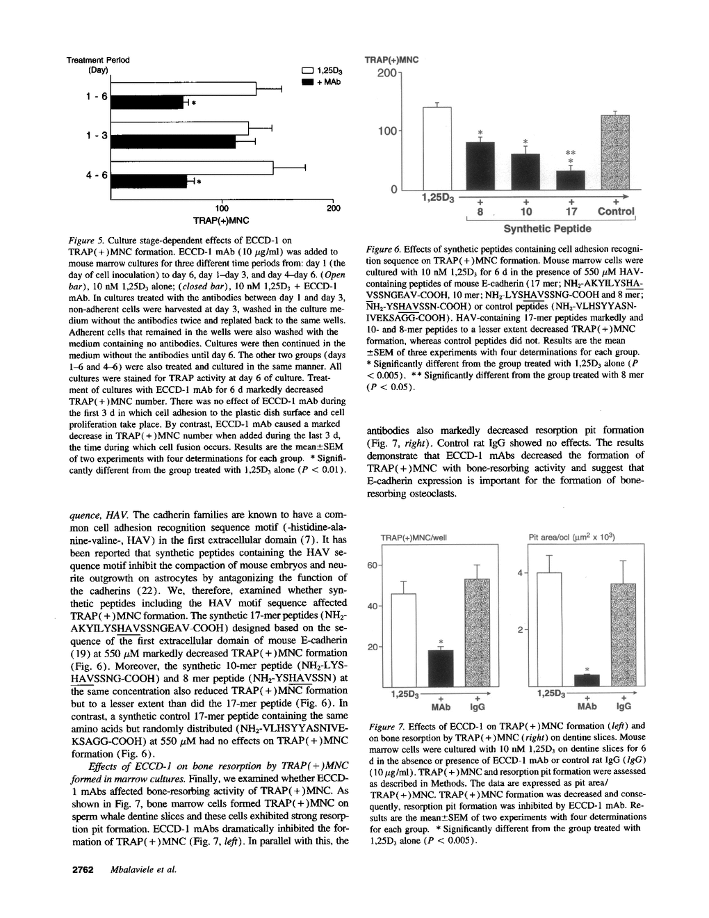 A critical step in bone resorption is the fusion of mononuclear osteoclast precursors to form multinucleated osteoclasts. However, little is known of the molecular mechanisms that are responsible for this important process. Since the expression of proteins in the cadherin family of homophilic calcium-dependent cell adhesion molecules is involved in the fusion process for certain other cells, we examined their role in osteoclast formation. Immunohistochemical examination of human and mouse bone using monoclonal antibodies to human and mouse E-cadherin clearly demonstrated positive staining in osteoclasts. N- and P-cadherin were not detected. In cultures of murine marrow mononuclear cells in which osteoclasts form by cell fusion, E-cadherin expression determined by Western blotting reached the highest levels as fusion was taking place. Expression of E-cadherin gene fragment was also detected in the marrow cultures by polymerase chain reaction. To study the functional role of E-cadherin expression in osteoclastic differentiation, neutralizing monoclonal antibodies were examined for their effects on osteoclast formation. The antibodies decreased the number of tartrate-resistant acid phosphatase (a marker of murine osteoclast)-positive multinucleated cell (TRAP-positive MNC) by inhibiting the fusion of mononuclear osteoclast precursors, but not proliferation of these cells or their attachment to plastic dish surfaces. This inhibitory effect was reversible. Furthermore, synthetic peptides containing the cell adhesion recognition sequence of cadherins also decreased TRAP-positive MNC formation. The antibodies and peptides inhibited not only osteoclast formation but also bone resorption. Antibodies to other types of cadherins and control rat IgG had no effects in these culture systems. Our findings suggest that E-cadherin expression may be involved in fusion (differentiation) of hemopoietic osteoclast precursors into mature multinucleated osteoclasts.