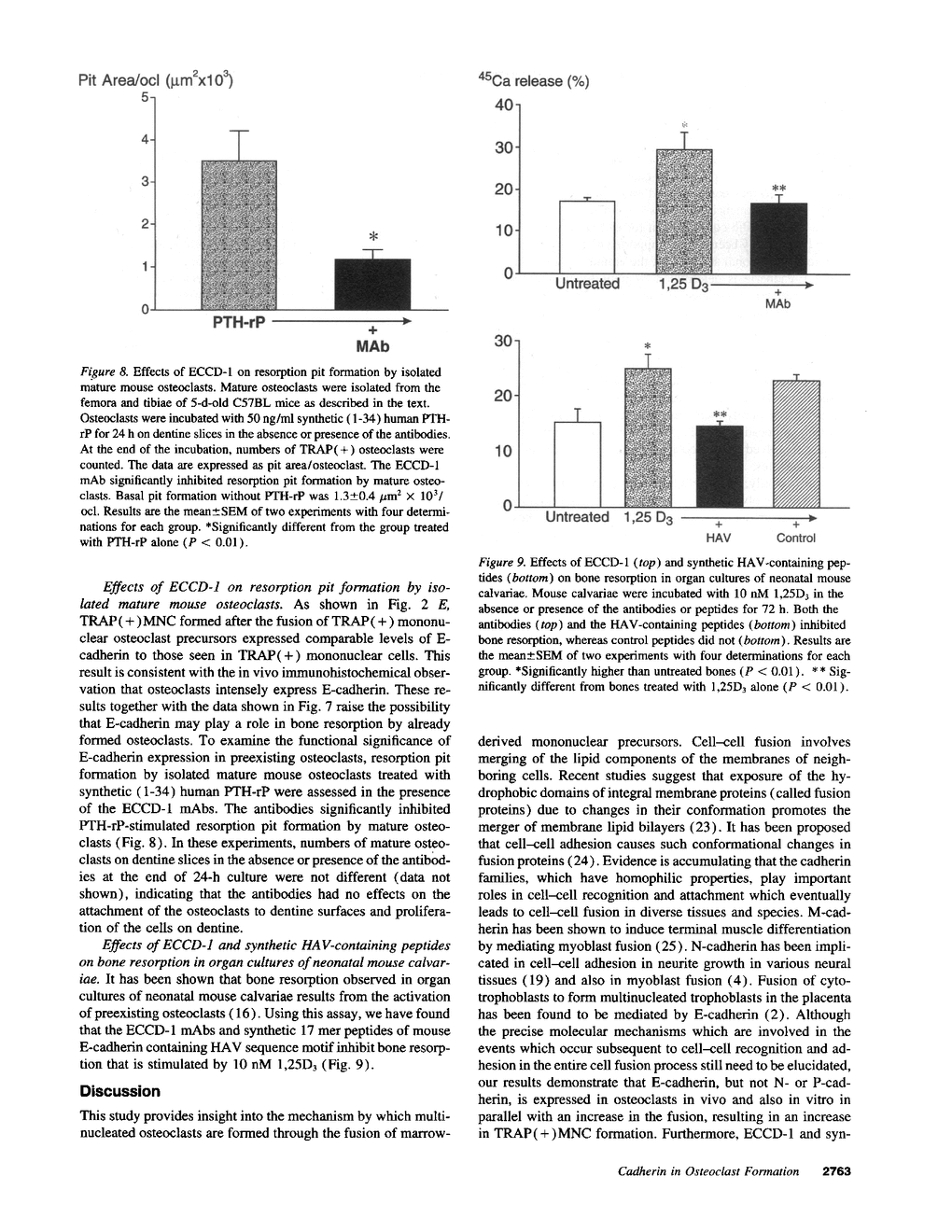 A critical step in bone resorption is the fusion of mononuclear osteoclast precursors to form multinucleated osteoclasts. However, little is known of the molecular mechanisms that are responsible for this important process. Since the expression of proteins in the cadherin family of homophilic calcium-dependent cell adhesion molecules is involved in the fusion process for certain other cells, we examined their role in osteoclast formation. Immunohistochemical examination of human and mouse bone using monoclonal antibodies to human and mouse E-cadherin clearly demonstrated positive staining in osteoclasts. N- and P-cadherin were not detected. In cultures of murine marrow mononuclear cells in which osteoclasts form by cell fusion, E-cadherin expression determined by Western blotting reached the highest levels as fusion was taking place. Expression of E-cadherin gene fragment was also detected in the marrow cultures by polymerase chain reaction. To study the functional role of E-cadherin expression in osteoclastic differentiation, neutralizing monoclonal antibodies were examined for their effects on osteoclast formation. The antibodies decreased the number of tartrate-resistant acid phosphatase (a marker of murine osteoclast)-positive multinucleated cell (TRAP-positive MNC) by inhibiting the fusion of mononuclear osteoclast precursors, but not proliferation of these cells or their attachment to plastic dish surfaces. This inhibitory effect was reversible. Furthermore, synthetic peptides containing the cell adhesion recognition sequence of cadherins also decreased TRAP-positive MNC formation. The antibodies and peptides inhibited not only osteoclast formation but also bone resorption. Antibodies to other types of cadherins and control rat IgG had no effects in these culture systems. Our findings suggest that E-cadherin expression may be involved in fusion (differentiation) of hemopoietic osteoclast precursors into mature multinucleated osteoclasts.